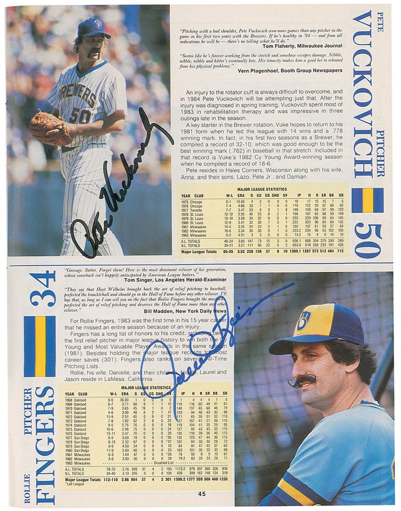 Official 1984 Milwaukee Brewers yearbook, 8.5 x 11, signed inside by Paul Molitor, Rollie Fingers, Don Sutton, Cecil Cooper (2), Pete Vuckovich, Tom Trebelhorn, Jim Gantner, Pete Ladd, Charlie Moore, Bob McClure, Tom Tellmann, Jerry Augustine, Dion James, Bill Schroeder, Ernest Riles, Bill Wegman, and Ray Searage. In fine condition.