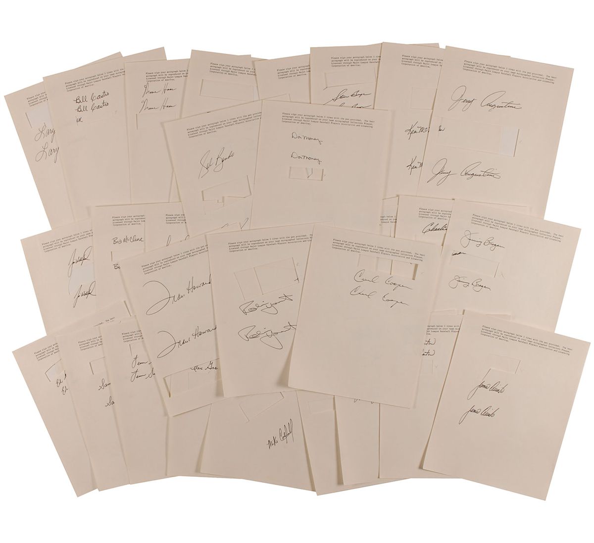 Thirty off-white 8.5 x 11 sheets, each bearing typed instructions to sign three times, with the best autograph to be used as an example for a facsimile on a collectible plaque. Each sheet is signed twice in black felt tip by a member of the late-1970s Brewers (specifically the 1977 Brewers as this combination of players with Steve Brye was only on the Brewers roster for that year), with the third having been clipped out to be used in creating the product. Signers include: Robin Yount, Frank Howard, Cecil Cooper, Don Money, Sal Bando, Moose Haas, Sixto Lezcano, Bill Castro, Lary Sorensen, Jerry Augustine, Steve Brye, Ed Kirkpatrick, Bob McClure, Larry Haney, Alex Grammas, Sam Hinds, Jamie Quirk, Jim Slaton, and Von Joshua. In overall fine condition.