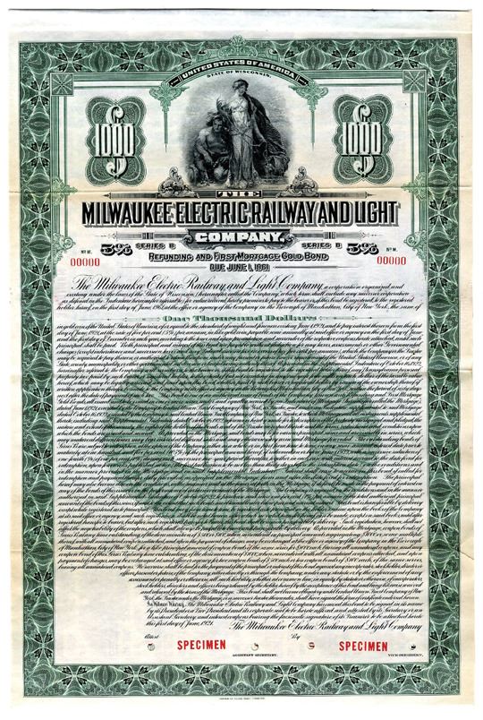 Milwaukee Electric Railway and Light Co., 1921 Specimen Bond
