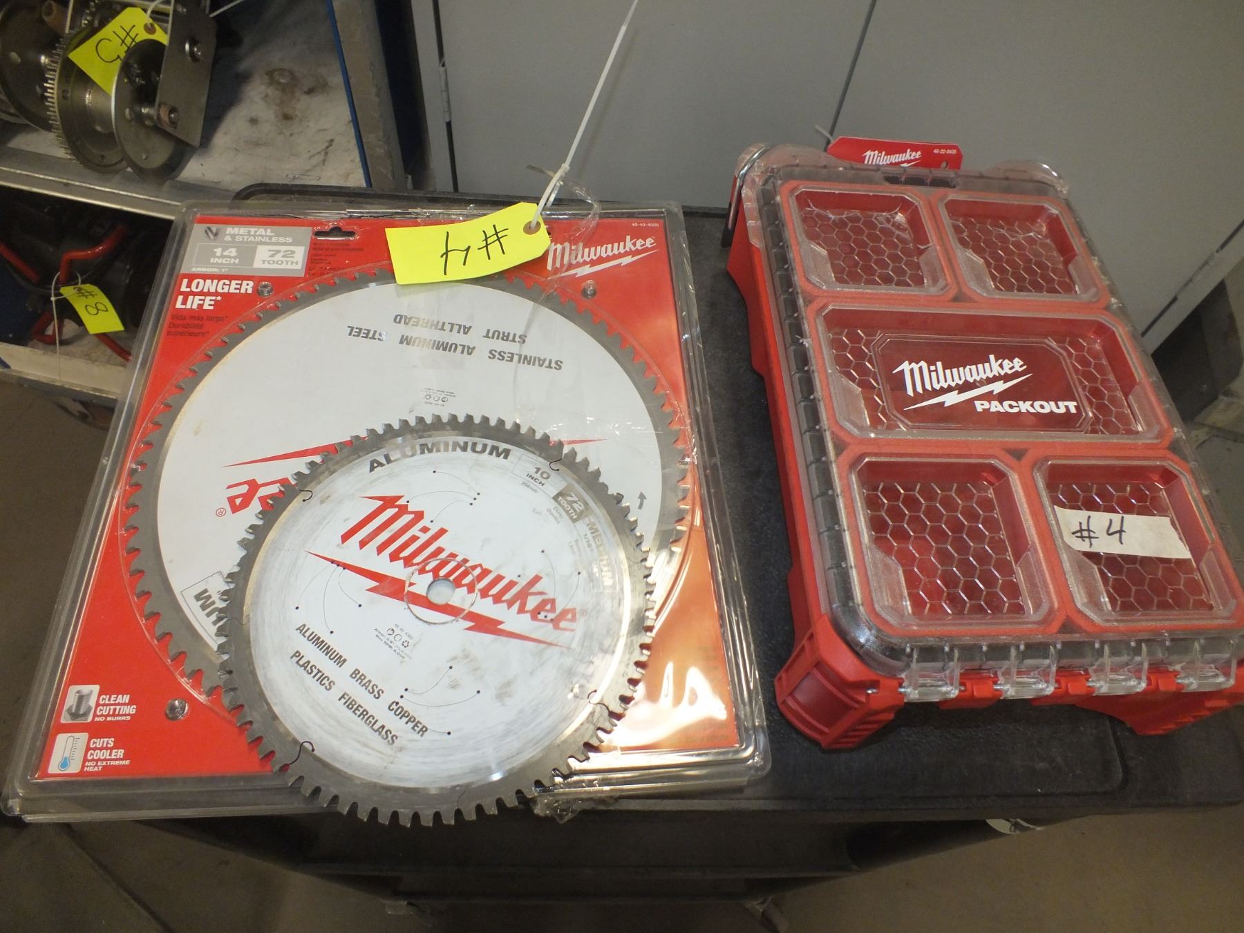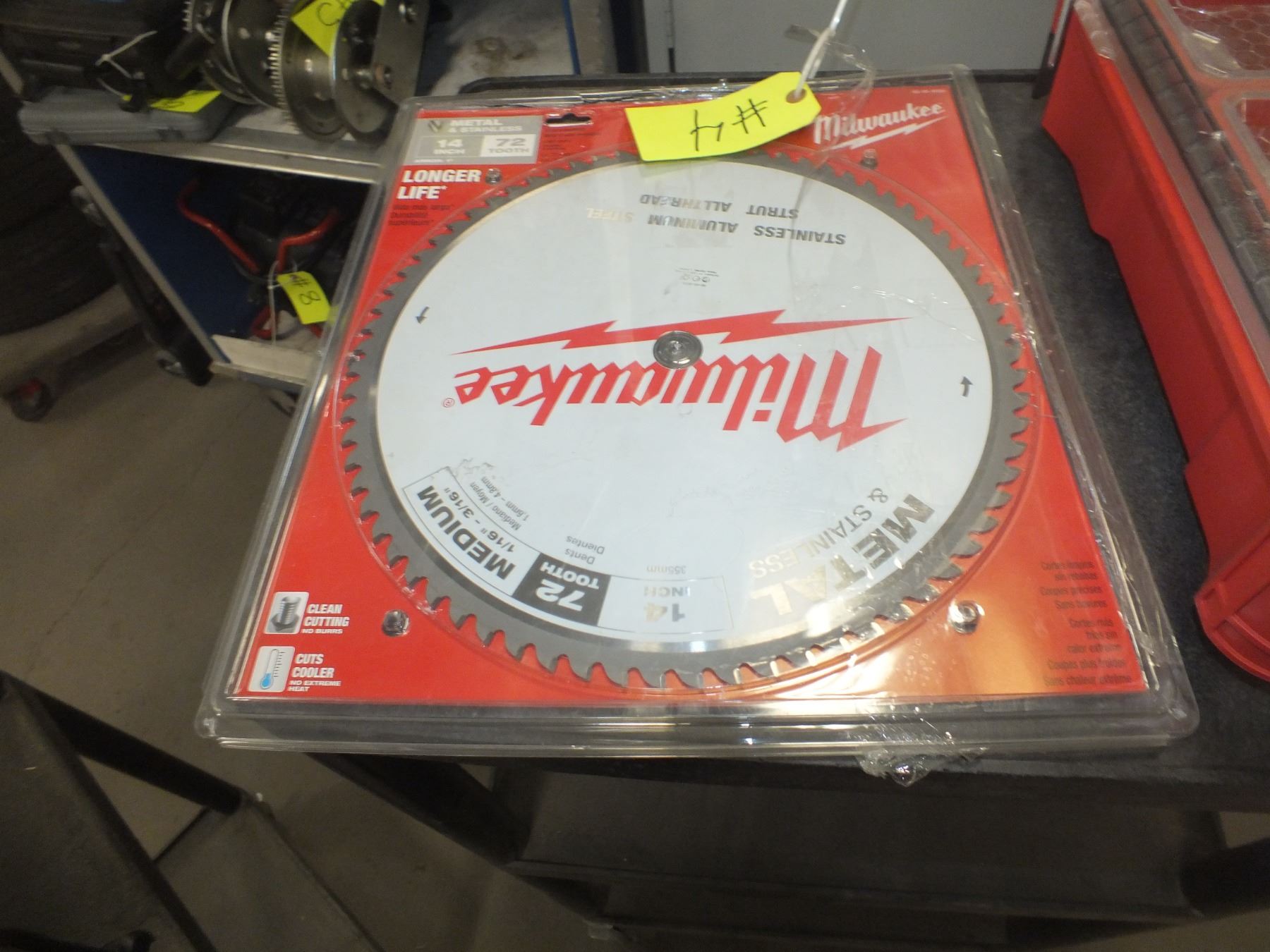 you get 1 14" 72 tooth saw blade, 1 10" 72 tooth saw blade, ad 1 pack out box...new/used