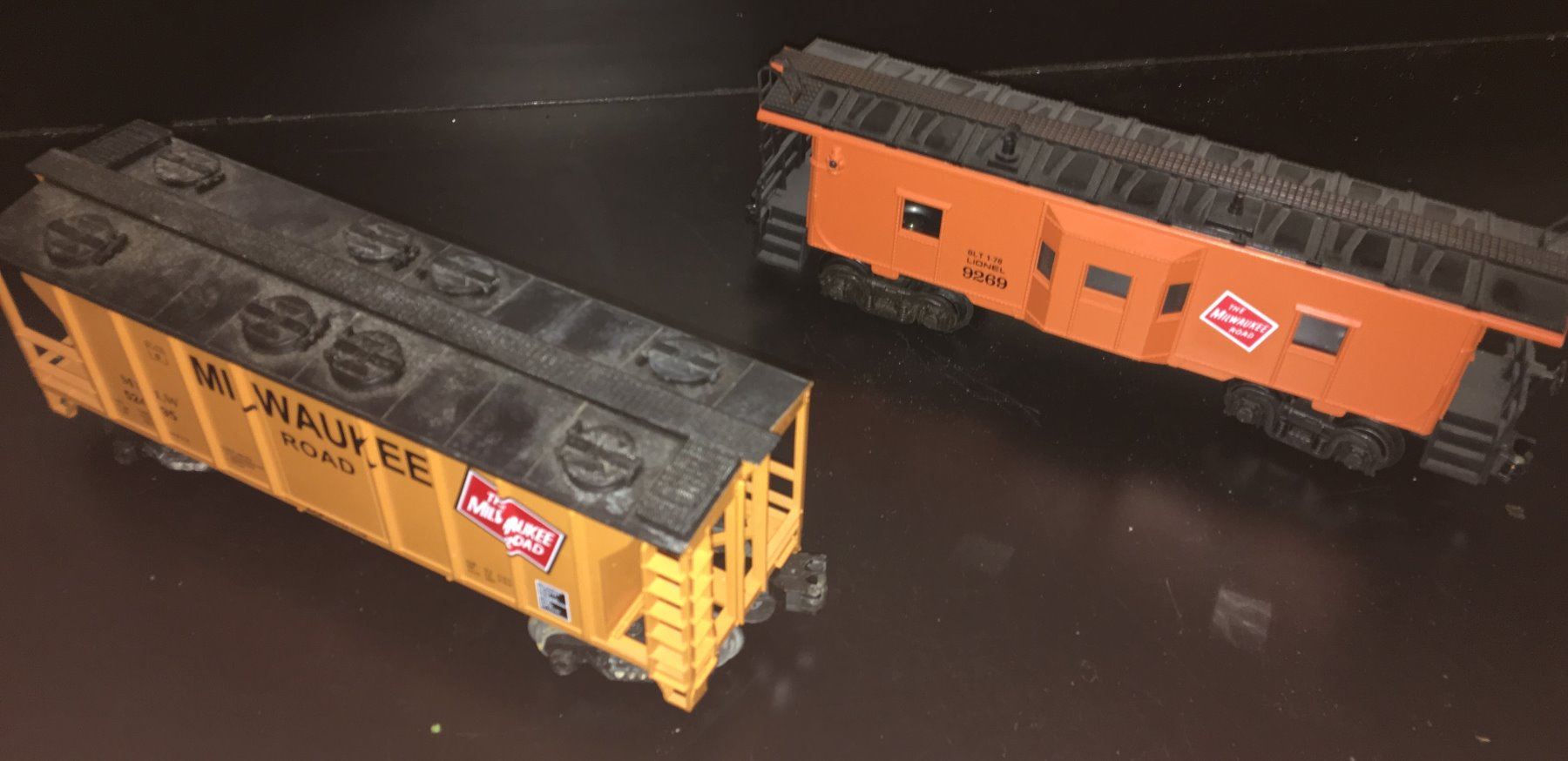 Two (2) Milwaukee Road O gauge freight cars. There is a Lionel 9269 lighted bay window caboose and an MTH covered two-bay hopper car.