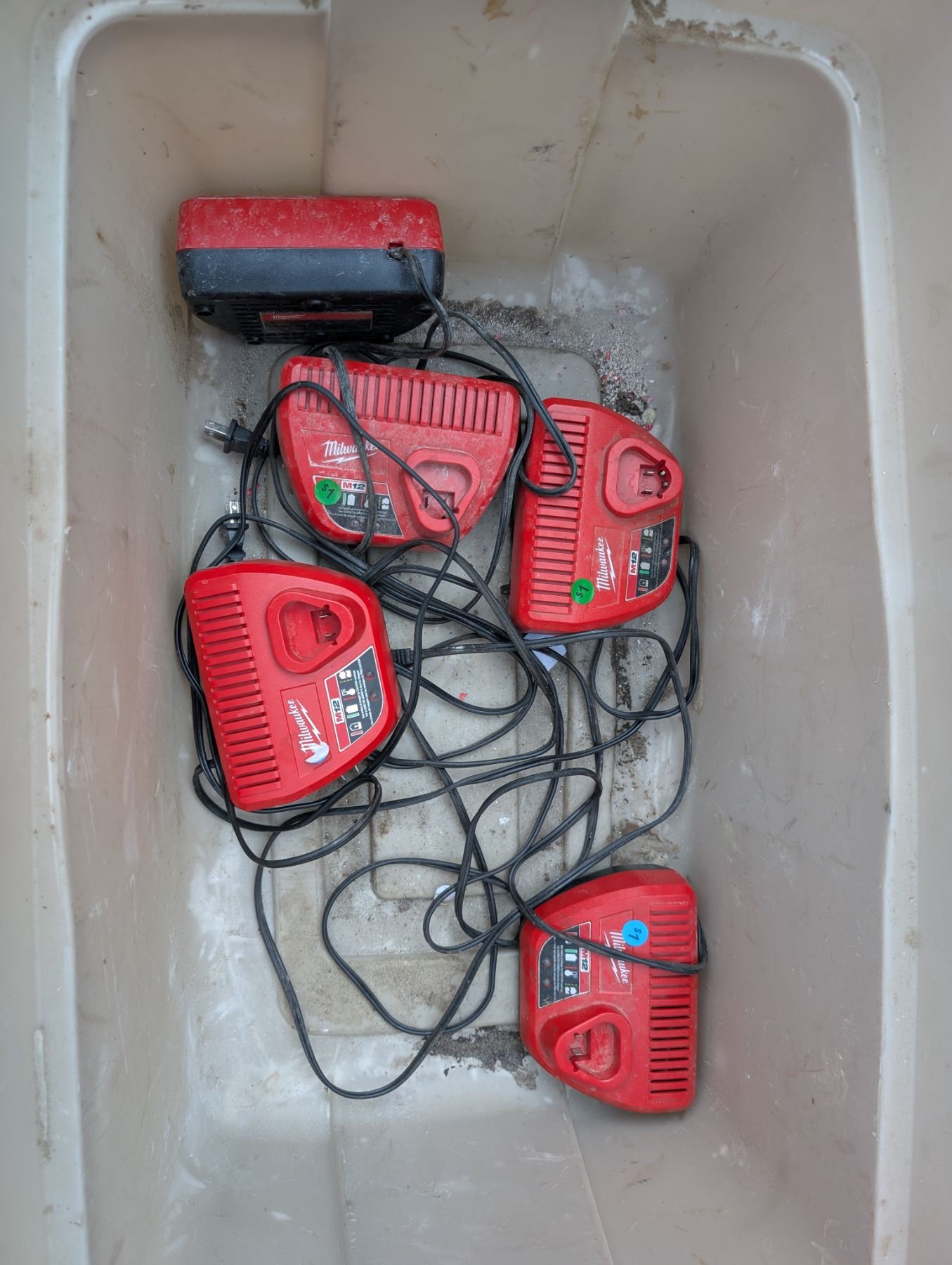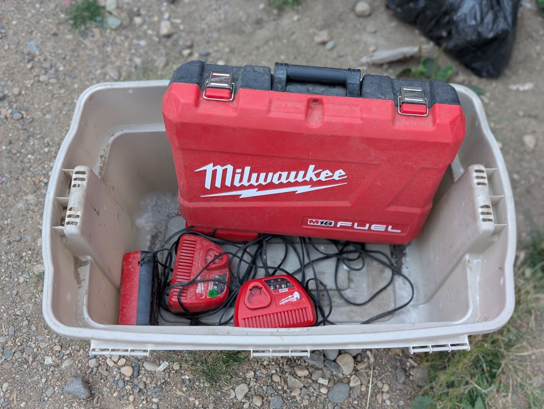 Milwaukee Tool Case for a Power Tool, Multiple Milwaukee tool Chargers, and Tubber ware Bin for Storage