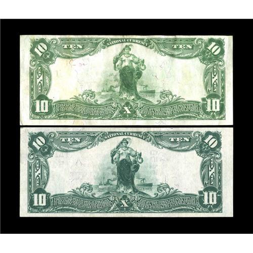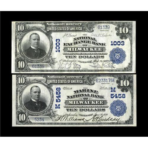<B>Two More Milwaukee Nationals.</B></I><BR><B>Milwaukee, WI</B></I> - $10 1902 Plain Back Fr. 624 <B>The National Exchange Bank</B></I> Ch. # 1003 <B>VF-XF<BR><B>Milwaukee, WI</B></I> - $10 1902 Plain Back Fr. 633 <B>The Marine NB</B></I> Ch. # (M)5458 <B>XF.</B></I><BR>Both of these Milwaukee notes are attractive, lightly circulated examples. The signatures are dark and the paper is bright.<BR><BR><b>Shipping:</b> Coin/Currency (<a target="_blank" href="http://www.heritageauctions.com/common/shipping.php">view shipping information</a>)