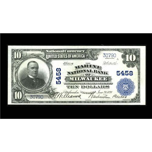 <B>Milwaukee, WI</B></I> - $10 1902 Plain Back Fr. 633 <B>The Marine NB</B></I> Ch. # 5458<BR>A gorgeous example with bright white paper and cavernous embossing. It's from plate A, and has retained its oversize top margin as well. <B>Gem Crisp Uncirculated.</B></I>