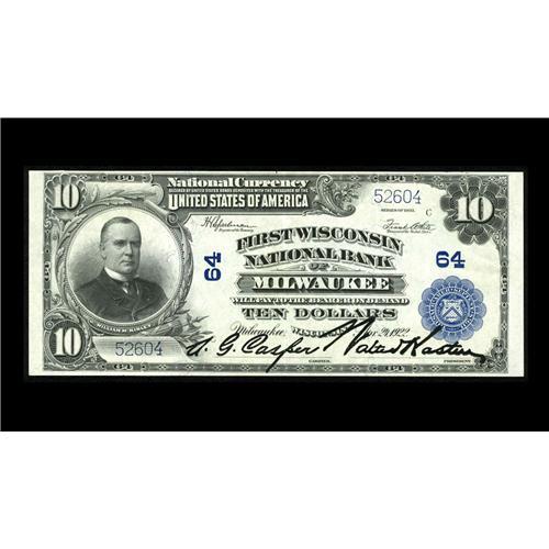<B>Milwaukee, WI</B></I> - $10 1902 Plain Back Fr. 635 <B>First Wisconsin NB</B></I> Ch. # 64<BR>Two light folds separate this note from Choice New. <B>Extremely Fine-About Uncirculated.</B></I>