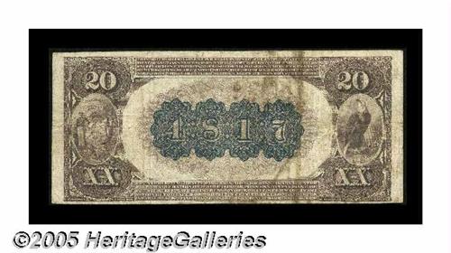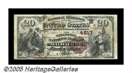 <B>Milwaukee, WI</B></I> - $20 1882 Brown Back Fr. 499 <B>The Wisconsin NB </B></I> Ch. # (M)4817<BR>A <B>Fine-Very Fine</B></I> Milwaukee Brown Back with dark signatures and superior centering. There is a bit of brown staining present from probable wallet storage as a keepsake.