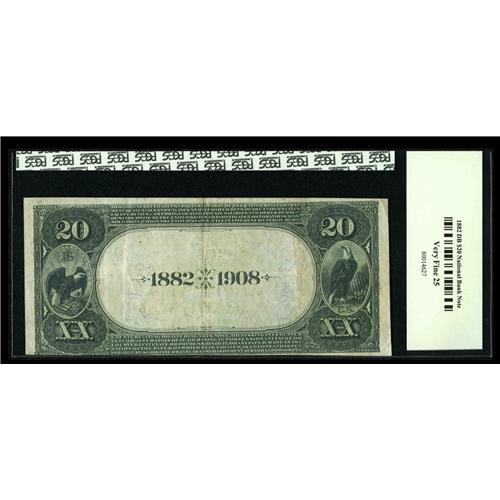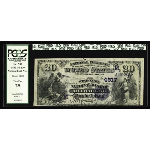<B>Milwaukee, WI</B></I> - $20 1882 Date Back Fr. 550 <B>The Wisconsin NB</B></I> Ch. # (M)4817<BR>Nice signatures of Wolf and Petit highlight this attractive mid-grade $20 that is in the census, but without a grade. <B>PCGS Very Fine 25.</B></I>