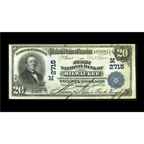 <B>Milwaukee, WI</B></I> - $20 1902 Date Back Fr. 642 <B>The First NB </B></I> Ch. #(M)2715<BR>A few scattered pinholes on this otherwise <B>Very Fine</B></I> Milwaukee note are mentioned for the sake of accuracy. The margins are unusually large and the prominently stamped officers' signatures remain vividly dark.