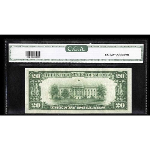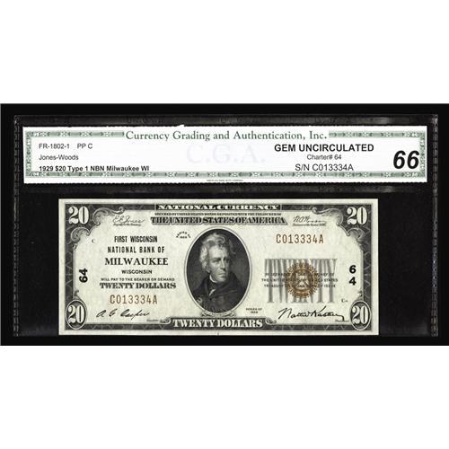 <B>Milwaukee, WI</B></I> - $20 1929 Ty. 1 <B>The First NB </B></I> Ch. # 64<BR>A <B>CGA Gem Uncirculated 66</B></I> from a prolific Milwaukee issuer. While this is certainly one of the most available banks from the Badger State, the certified condition is simply exceptional and should carry it to the level its lofty grade deserves. We deem that to be at a minimum in the range of...