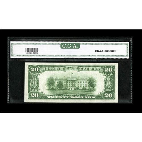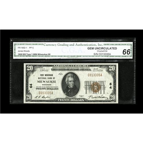 <B>Milwaukee, WI</B></I> - $20 1929 Ty. 1 <B>The First NB </B></I> Ch. # 64<BR>Another superlative note from here on a sheet consecutive to the example above. The one time headquarters building for this institution is the tallest structure in Wisconsin and now bears the U.S. Bank banner on Wisconsin Avenue in downtown Milwaukee. <B>CGA Gem Uncirculated 66.</B></I>