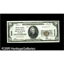 <B>Milwaukee, WI</B></I> - $20 1929 Ty. 1 <B>The Marine National Exchange Bank </B></I> Ch. # 5458<BR>This note bears the second title under which this Badger State institution issued, one which it adopted after the Marine Bank absorbed the old National Exchange Bank. While certainly not scarce judged by bank rarity, this lovely <B>Gem Crisp Uncirculated</B></I> note is about as nice as they come in this series. It has everything to offer, bright color, pack fresh original paper surfaces and unusually wide margins. A lightly bumped upper right corner is mentioned to insure full disclosure, yet hardly detracts from the overall visual impact of this stunning example. Lot:17020