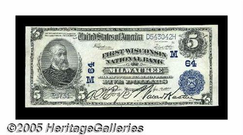 <B>Milwaukee, WI</B></I> - $5 1902 Plain Back Fr. 609 <B>First Wisconsin NB</B></I> Ch. # (M)64<BR>A lovely large size note fit for the finest of collections. Crackling-fresh <B>Gem Crisp Uncirculated,</B></I> with bright white paper, bold black signatures, and great eye appeal.