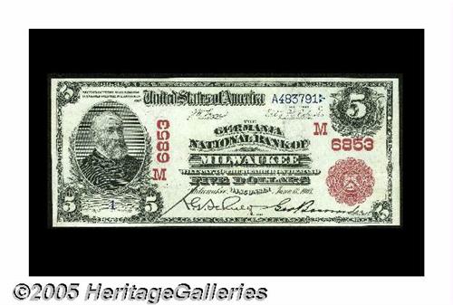 <B>Milwaukee, WI</B></I> - $5 1902 Red Seal Fr. 587 <B>The Germania NB</B></I> Ch. # (M)6853<BR>This serial number 1-C note is the first note in a trio of gorgeous low-numbered $5 Red Seals from this bank. The Germania was chartered in June 1903 just as the Red Seals were going to the presses, making these $5s some of the very first notes for this bank. This $5 is also only the eighth serial number 1 Red Seal for all denominations for the entire state. This well embossed $5 was gingerly cut from its sheet brethren, leaving behind nice margins to go along with this note's deep red, blue, and green inks. The signatures also look like they were applied earlier today, and not over a 100 years ago. This sensational $5 Red Seal will certainly strike a chord with the paper money community tonight. <B>Superb Gem Crisp Uncirculated.</B></I>