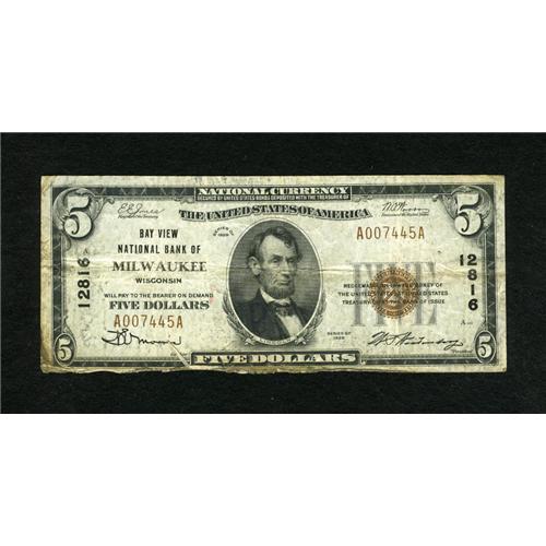 <B>Milwaukee, WI</B></I> - $5 1929 Ty. 1 <B>Bay View NB</B></I> Ch. # 12816<BR>The second title used by this institution, found only on small notes. A bit of margin roughness along the bottom is noticed on this still bright <B>Very Good-Fine</B></I> example.<BR><BR><b>Shipping:</b> Coins & Currency (<a target="_blank" href="http://www.heritageauctions.com/common/shipping.php">view shipping information</a>)