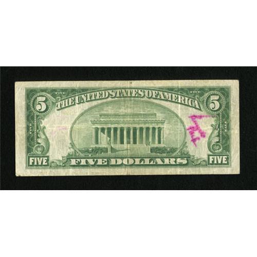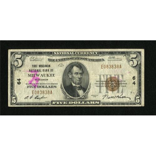 <B>Milwaukee, WI</B></I> - $5 1929 Ty. 1 <B>First Wisconsin NB</B></I> Ch. # 64<BR> A pink pen mark is noticed at left on this still bright with a radar serial number of sorts. <B>Very Good</B></I>.<BR><I>From The John Ameen Collection</B></I><BR><BR><b>Shipping:</b> Coins & Currency (<a target="_blank" href="http://www.heritageauctions.com/common/shipping.php">view shipping information</a>)