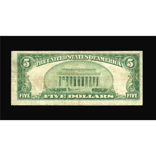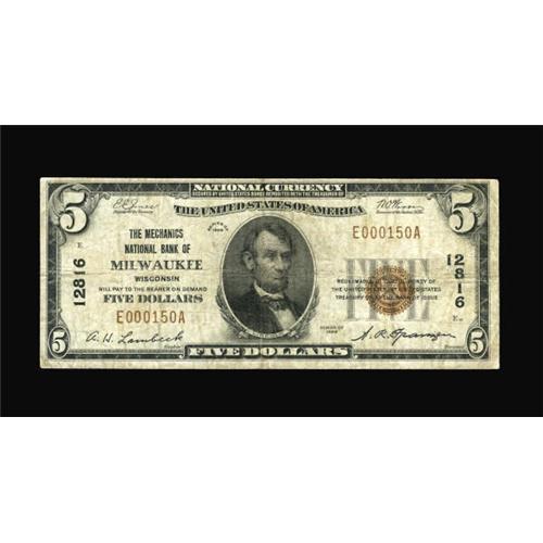 <B>Milwaukee, WI</B></I> - $5 1929 Ty. 1 <B>The Mechanics NB</B></I> Ch. # 12816<BR> Notes from this institution, which failed in 1930, are by far the most difficult to find of any of Milwaukee's small size issuers. Interestingly, after the bank failed its assets were acquired by the Bay View State Bank located on the city's southeast side. That bank converted to national status and issued Bay View NB notes under the acquired charter, which was actually that of this institution. Thus two banks, each in a different location, issued notes using one charter number, a rare if not unique occurrence. This is one of just ten examples listed in the census bearing this title. <B>Fine.</B></I><BR><BR><b>Shipping:</b> Coins & Currency (<a target="_blank" href="http://www.heritageauctions.com/common/shipping.php">view shipping information</a>)