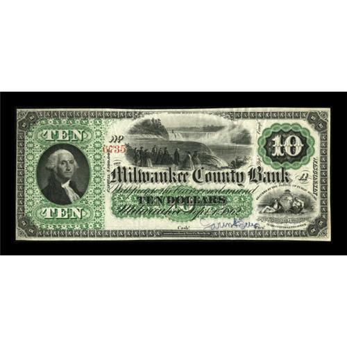 <B>Milwaukee, WI- Milwaukee County Bank</B></I> $10 Sept. 1, 1862 G4 Krause 4<BR> A spectacular late issue American Bank Note Company product featuring a green tint, a neat Washington portrait, and a central vignette of Niagara Falls. <B>Extremely Fine, </B></I>falsely filled in, but a truly great obsolete note that is as rare as it is pretty. <BR><BR><b>Shipping:</b> Coins & Currency (<a target="_blank" href="http://www.heritageauctions.com/common/shipping.php">view shipping information</a>)