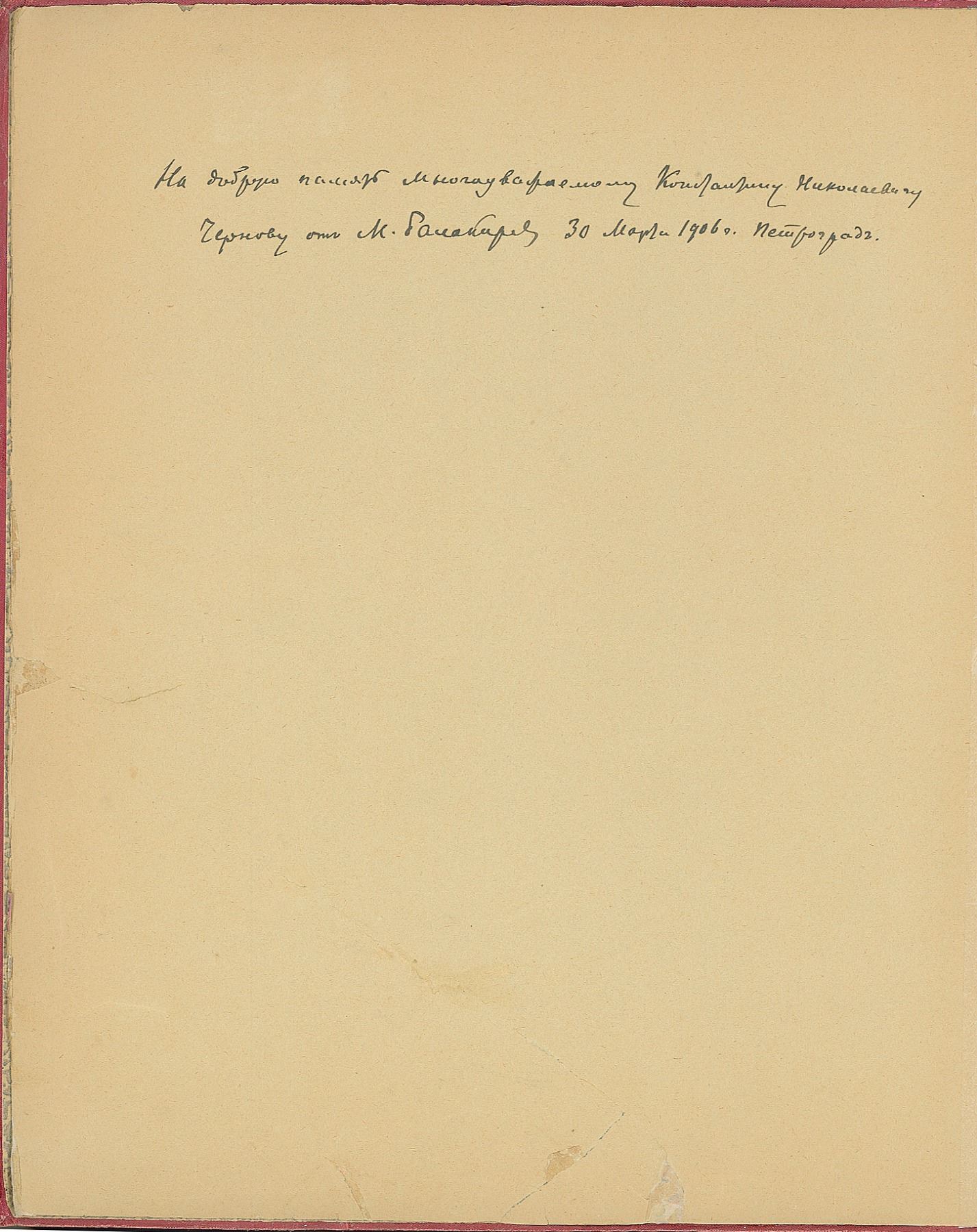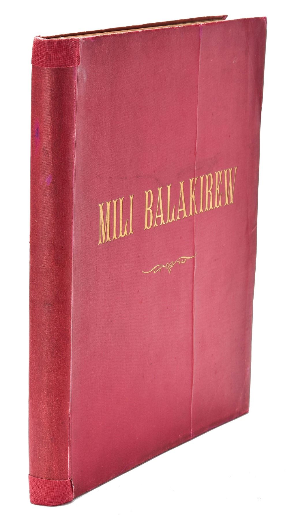 Russian pianist, conductor and composer (1837–1910) who is best remembered for his work promoting musical nationalism and his encouragement of more famous Russian composers, most notably Pyotr Ilyich Tchaikovsky. Attractive custom-bound softcover booklet containing various works from Russian composer Mily Balakirev, 10.75 x 12.75, signed and inscribed in Cyrillic on the inside of the first free end page in fountain pen by Balakirev, who adds a date of March 30, 1906. The booklet features a wide assortment of sheet music from Julius Heinrich Zimmermann and other notable music publishers, with the works consisting of sonatas, waltzes, toccatas, nocturnes, and more; the majority are original Balakirev pieces, with some transcriptions by Balakirev of works by Hector Berlioz, Sergei Taneyev, and others. In very good to fine condition, with repaired tears to the bottom of the signed page, wear and a vertical crease to the front cover, repairs to the ends of the spine, and foxing and staining to some inner pages, although the majority are clean and unaffected.