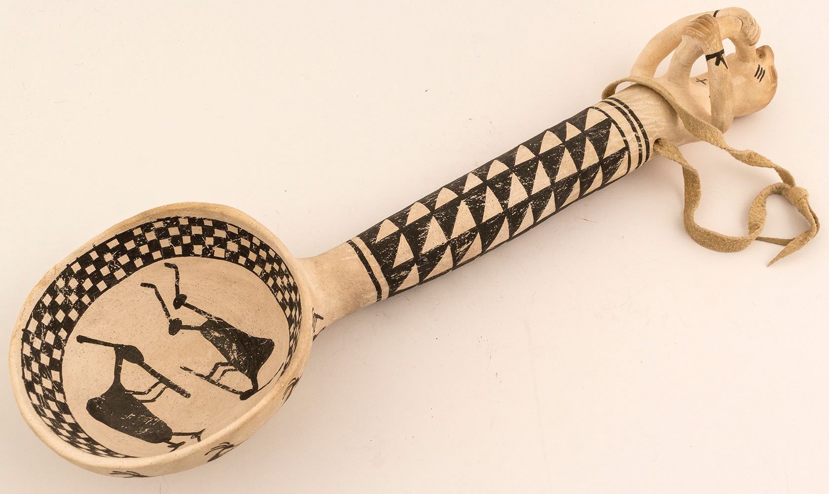 Mimbres design ladle, Michael Kanteena, features "flute players" with man playing flute at top of handle. 15.5" l x 4.75" w. His present style of work began to develop six years ago. Wishing to learn about his ancient roots, which he knew went back to New Mexico’s Chaco Canyon (the “Anasazi” culture), he began collecting archaeological catalogues of pottery forms.Through extensive study, trial and error, and even consultation with archaeologists, he developed his pottery into remarkably close recreations of the Chacoan and Mesa Verde pieces. Since then, Michael has allowed his studies to expand into the Mimbres and ancient Mexican Indian clay forms, where human and animal effigies are common. More recently he has explored the ancient Hopi figures and designs. Date: Location: Laguna Pueblo, New Mexico HWAC # 49325
