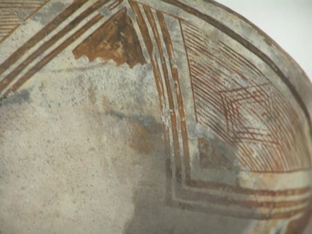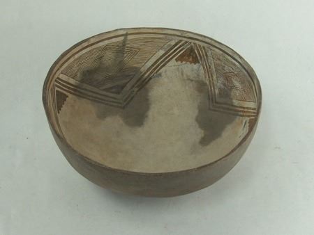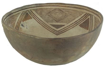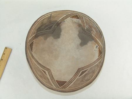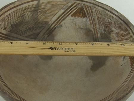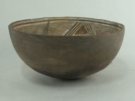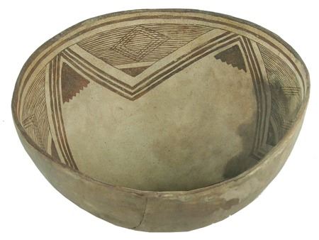 Prehistoric, Larger and beautiful Mimbres pottery bowl with "blossom" style curvilinear design. Very good condition, some professional restoration. 5-1/4" x 11-3/8"