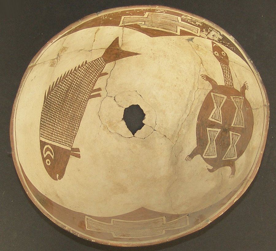 Wonderful, killed, black-on-white bowl with opposing fine line crosses near the rim, a wonderful fish on one side, and a turtle on the other, both with cross-hachured features. Good condition, with kill hole, glued but,Pre-Historic,5 1/4" x 12" (#110 in the Baca book)