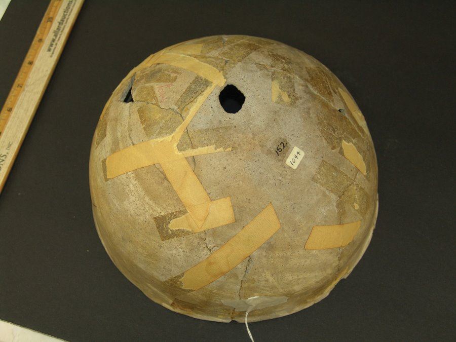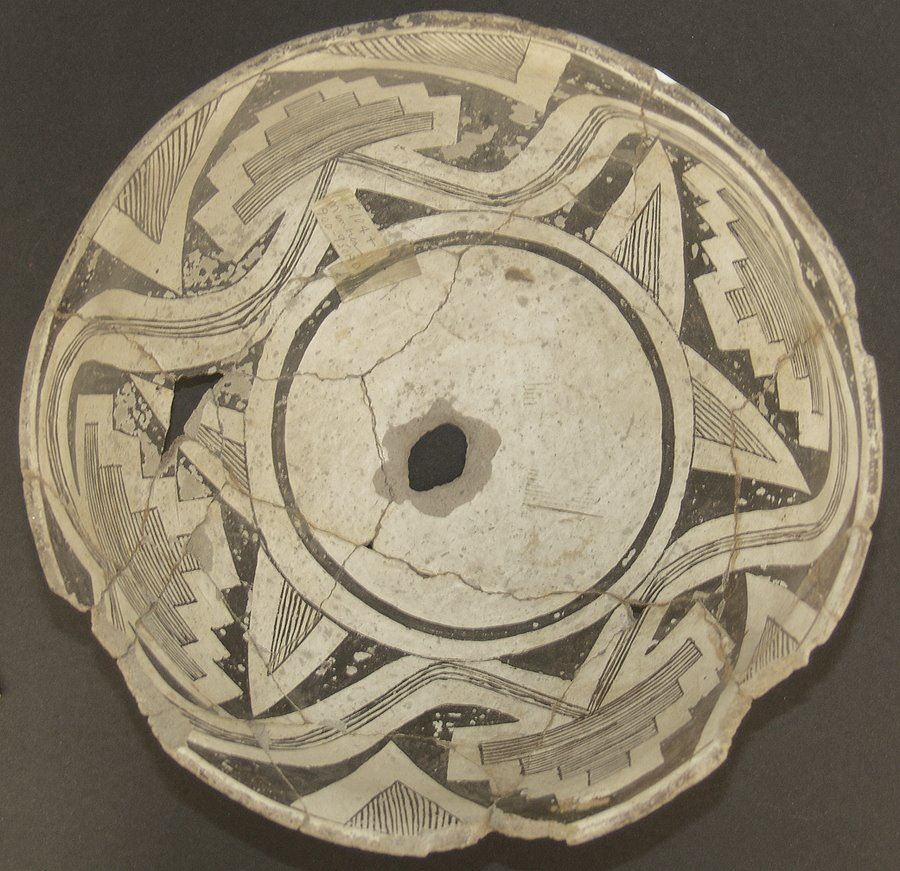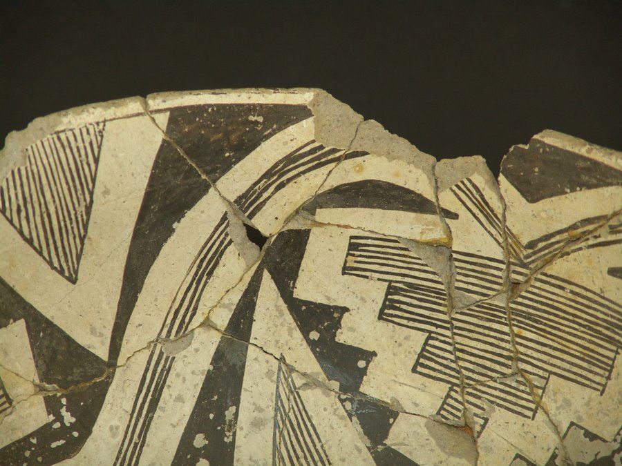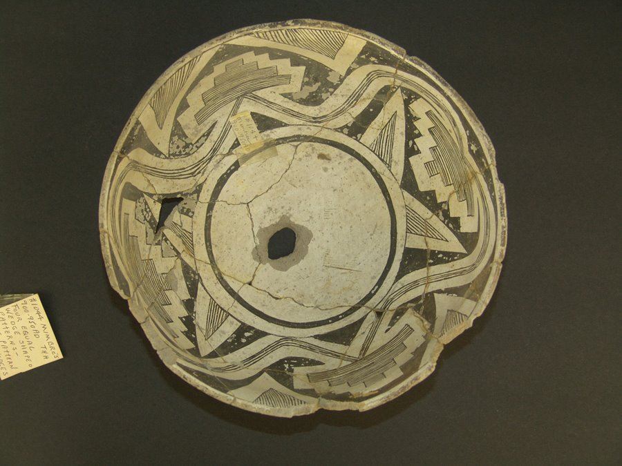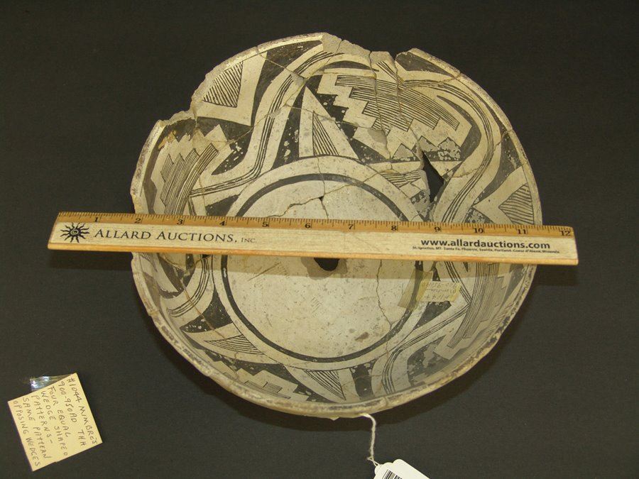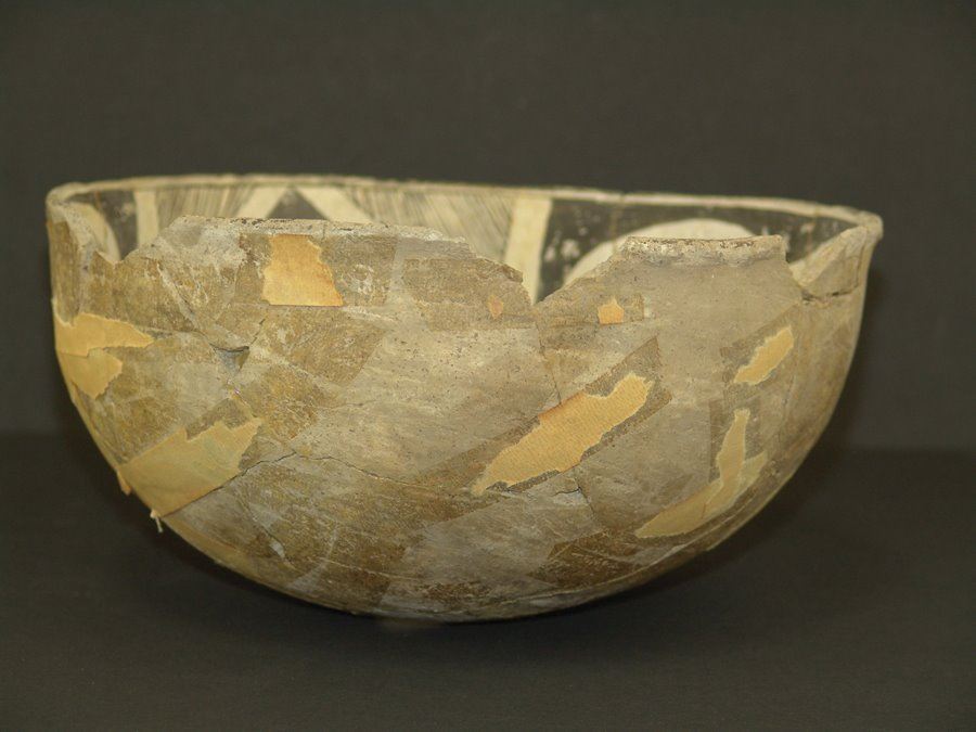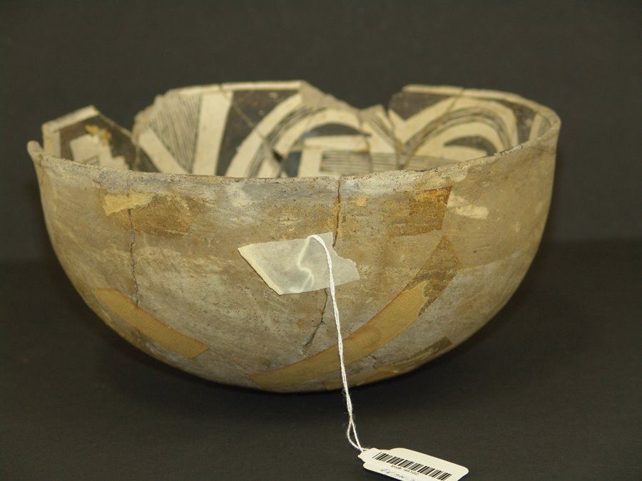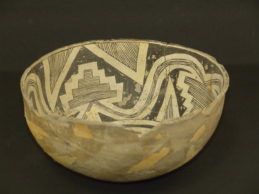 Killed, black-on-white deep bowl with a wide band of hachured triangles, multiple stepped elements, and fine line curvilinear forms. Good condition, glued but unrestored- some missing pieces, tape remnants on exterior. Pre-Historic 4 3/4 x 9 3/4
