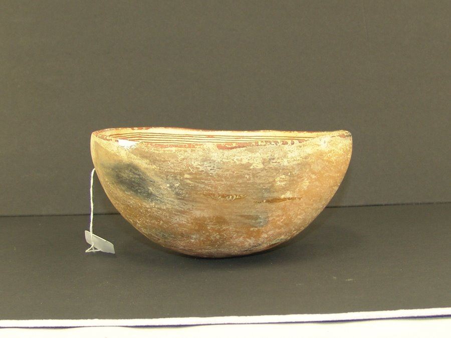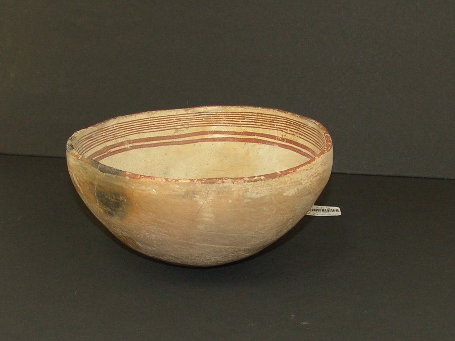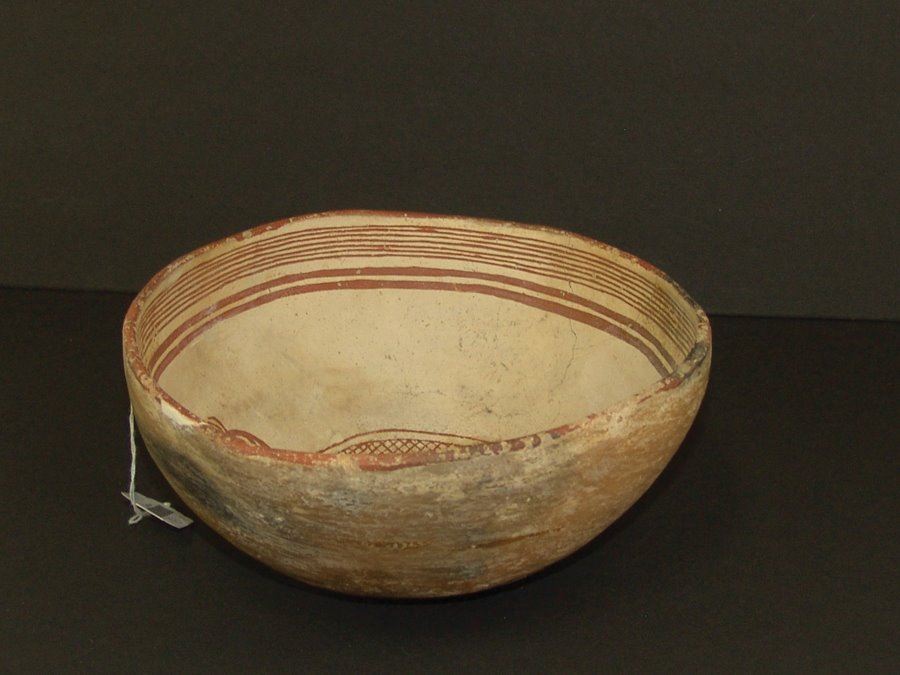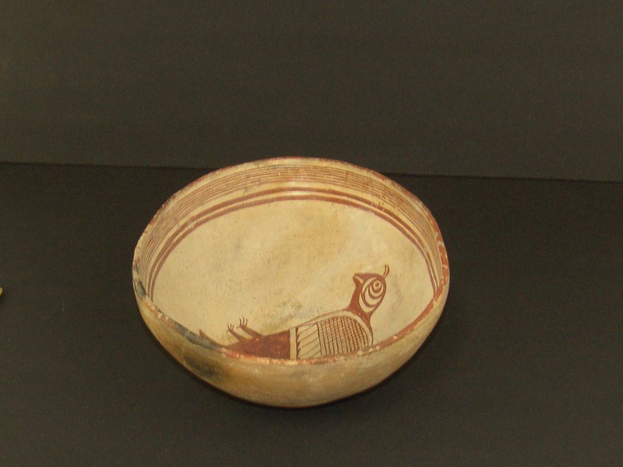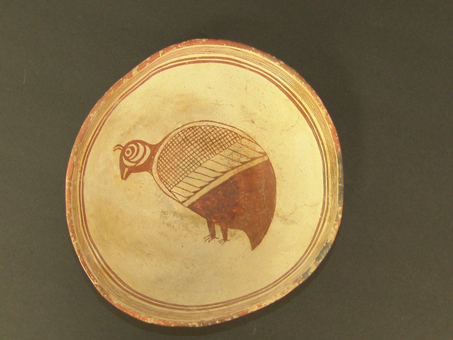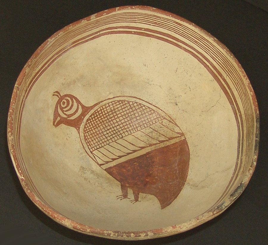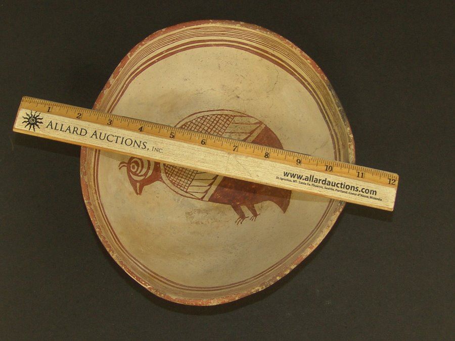 Geometric and graphic brownish red-on-white bowl the rim band with seven fine and two bold lines, the center containing a very rare stylized quail figure whose body has cross hatched and solid sections. Very good condition, kill hole filled in, glued and professionally restored. (#60 in Baca book). 4" x 8-3/4 "