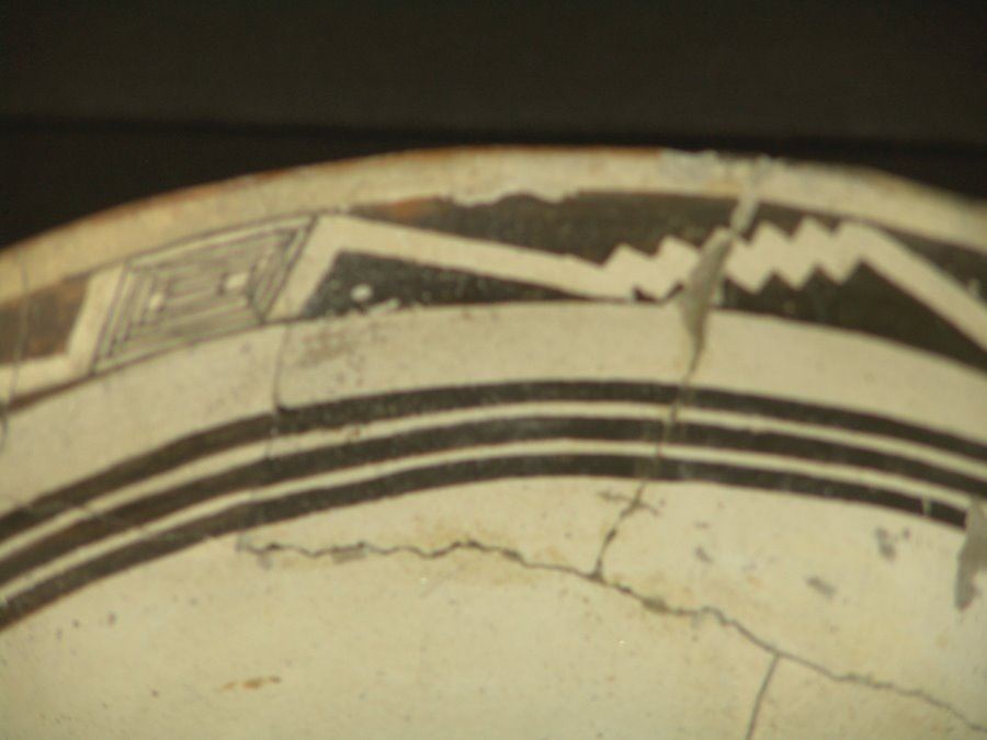 Rare, flared rim black on white killed bowl with geometric design band and triple line band below the rim. Marked "Bold Face, Phase Two". Good condition. Glued, but not restored (This piece not in Baca book). 4-3/4" x 8-1/2"