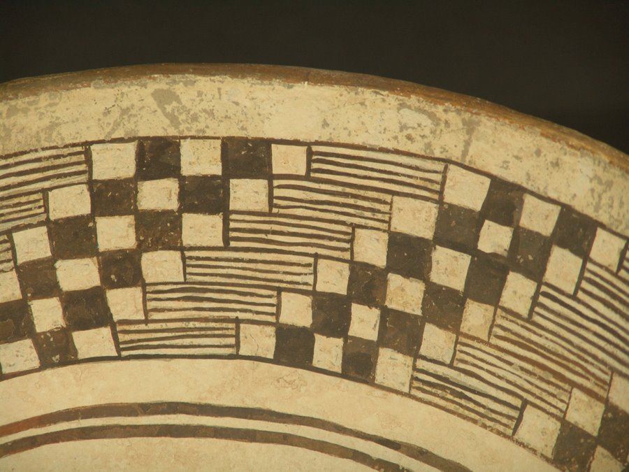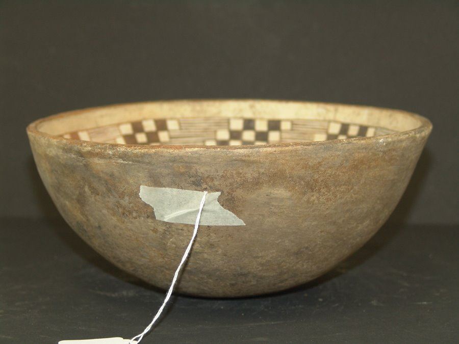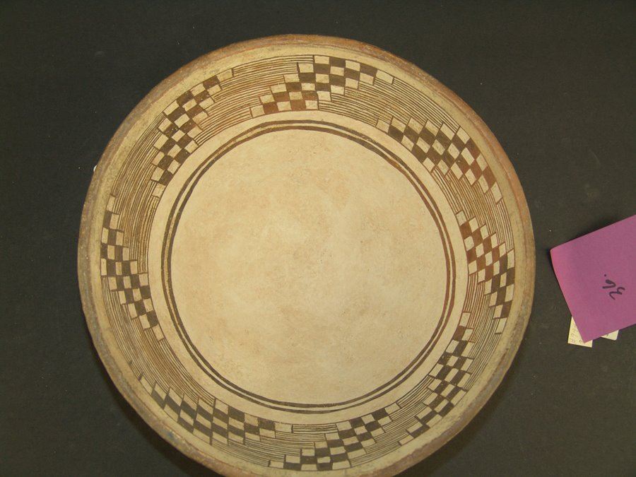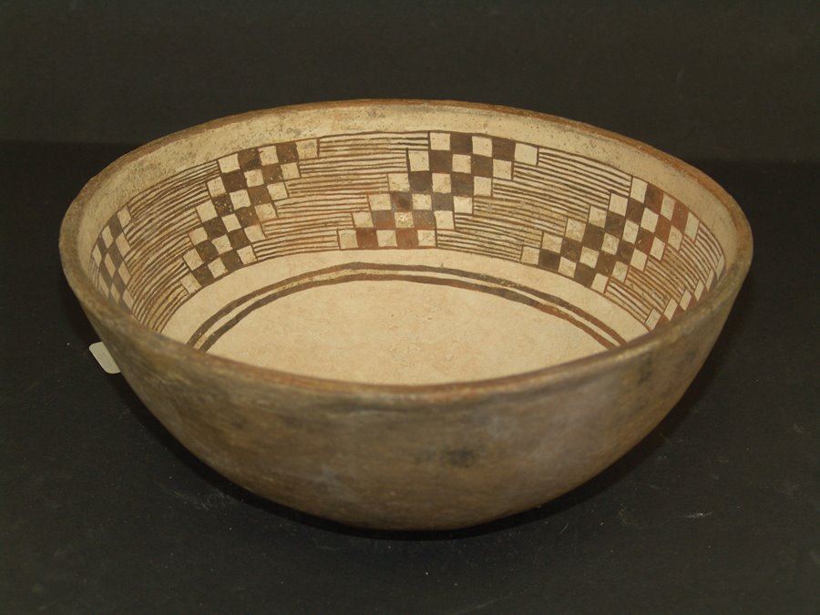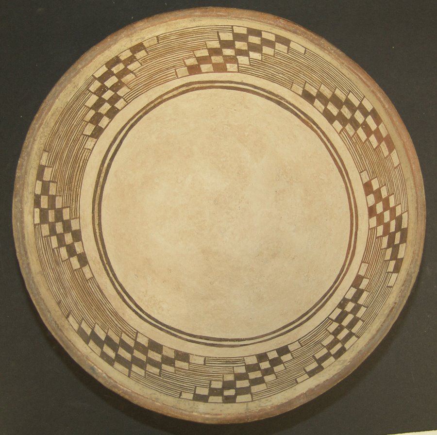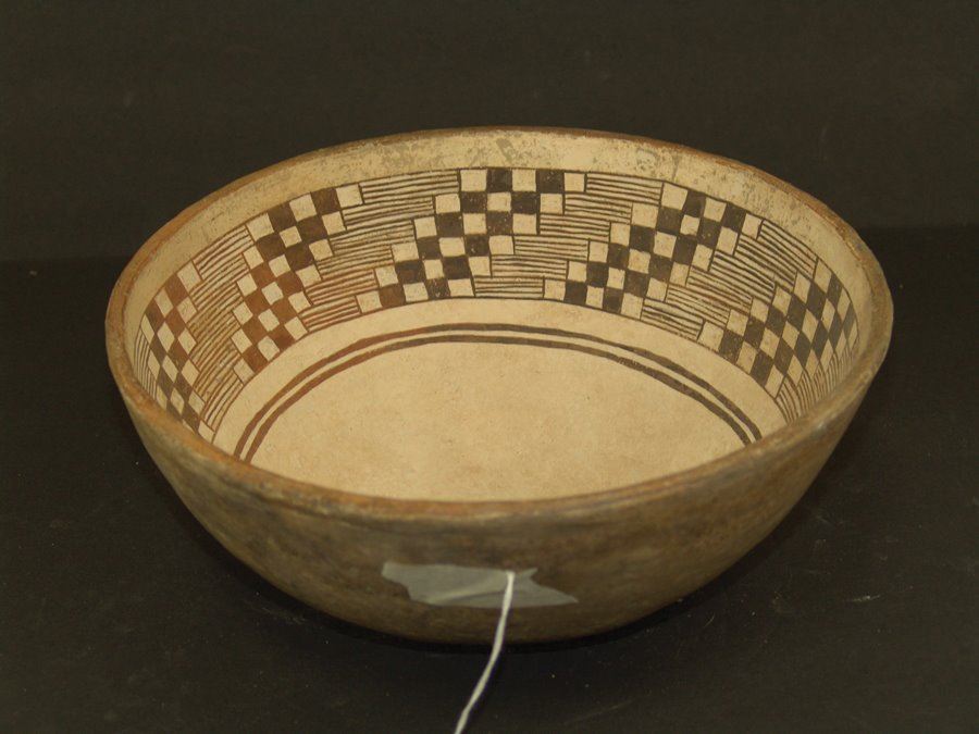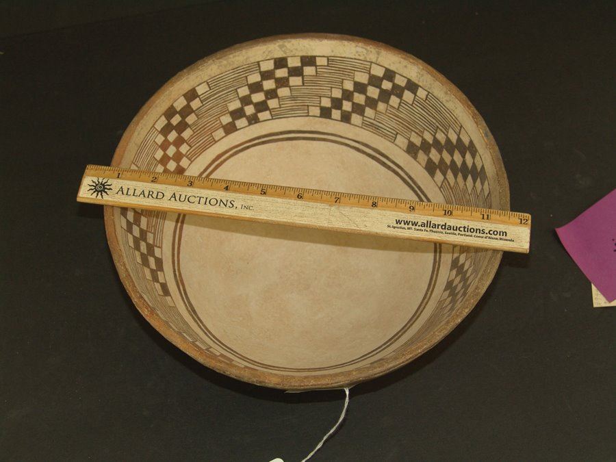 Beautiful, complete, black-on-white bowl the wide hachured design band with eight stepped, checkered devices, and with a double wide line band below. Very good condition, kill hole filled in and some over painting. (#36 in the Baca book) 4" x 9-1/2"