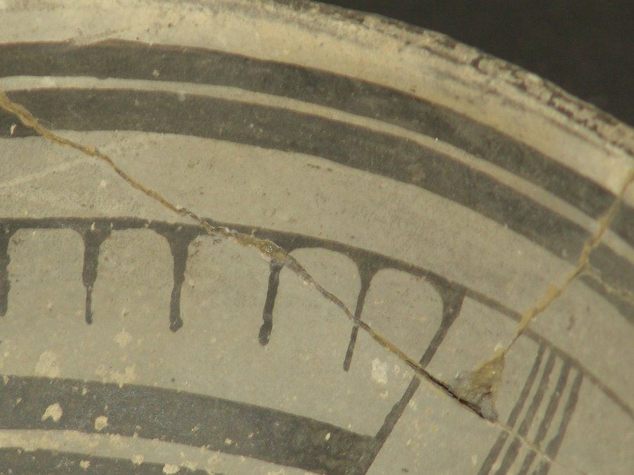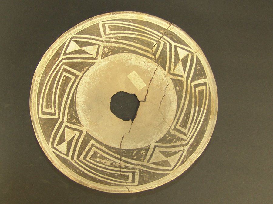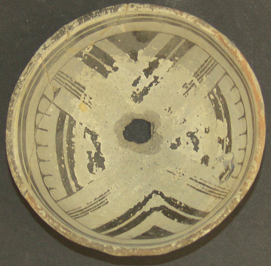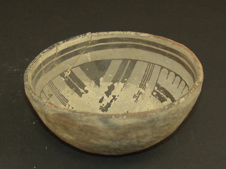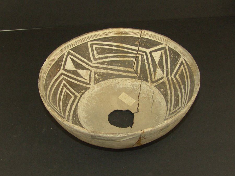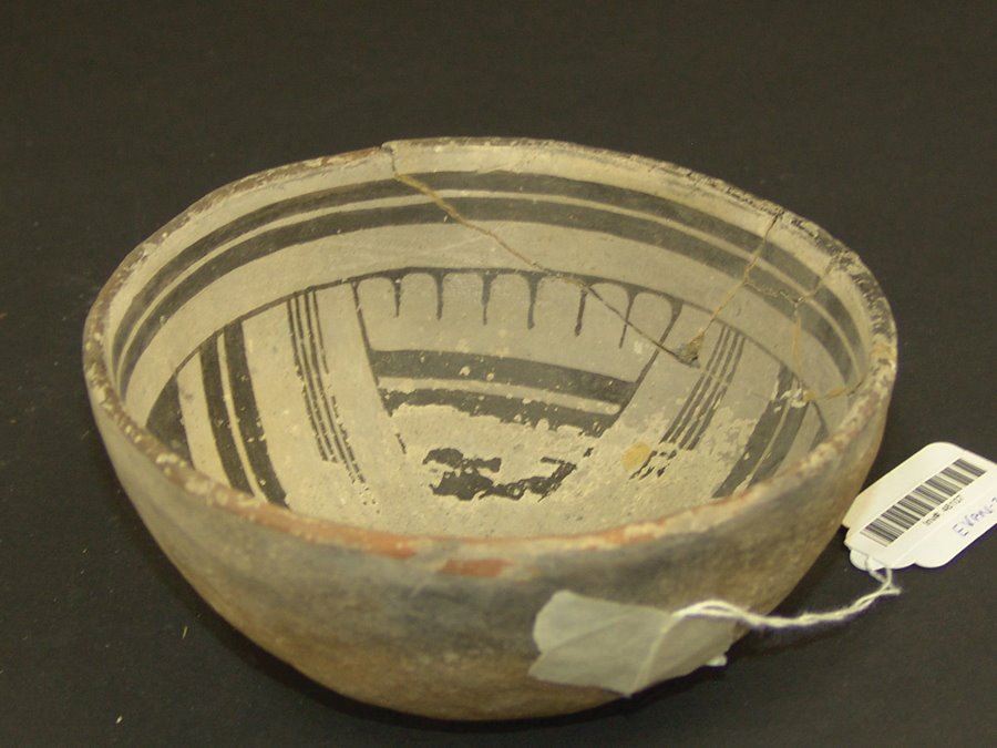 Killed, black-on-white bowl with double wide line rim band and with opposed fine line and wide line chevron pendants between two rare, radiating feather sections. Fair condition, restored but paint has flaked (#126 in the Baca book) 2-3/4" x 7"