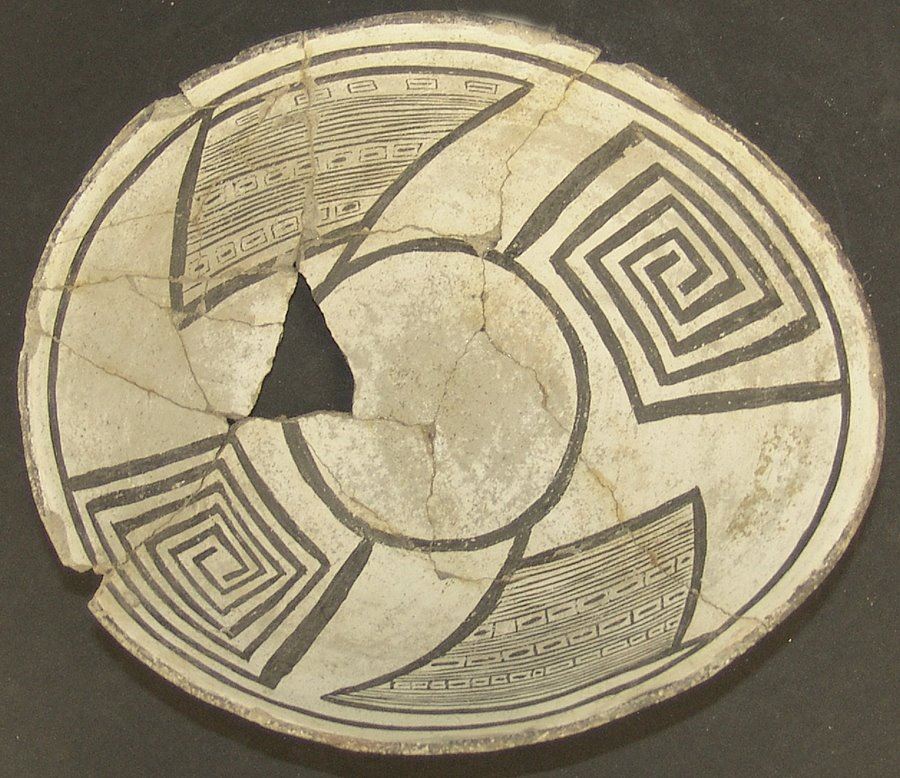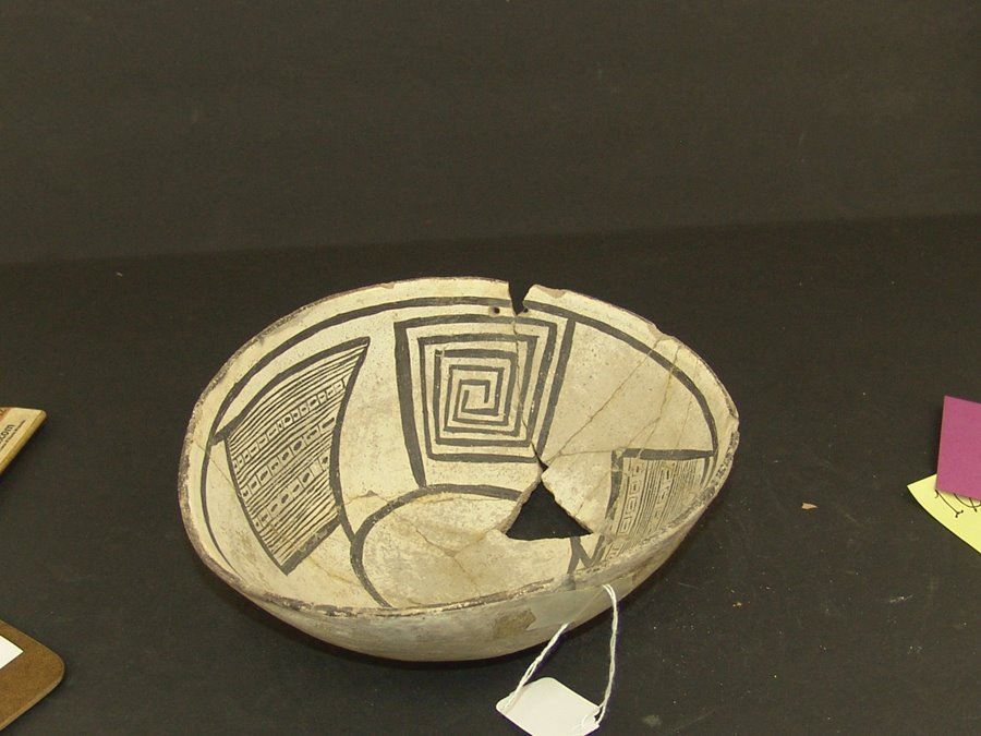 Classic, ovoid, black-on-white bowl with wide open design band containing large opposing squared scrolls alternating with large hachure diamond blocks zoned with three rows of linear blocks. Good condition, no kill hole. Glued but not restored, missing two shards. (#142 in the Baca book) 3-1/2" x 8-9"