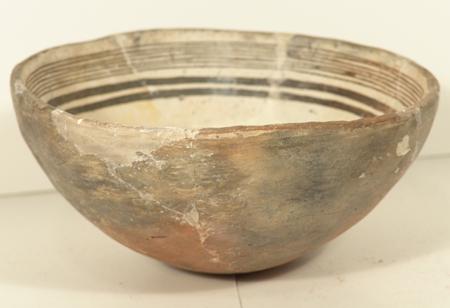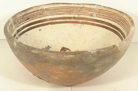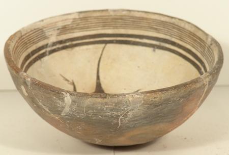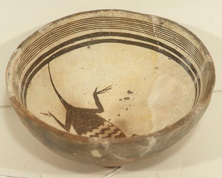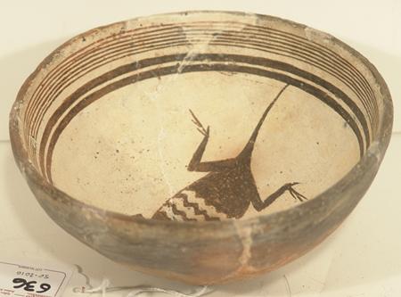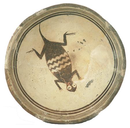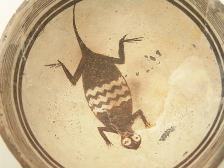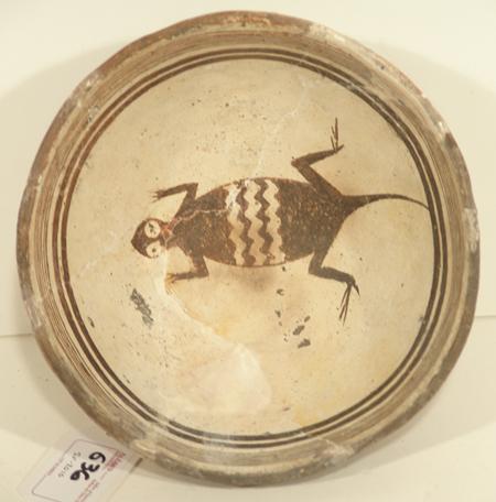 Rare thin-walled black-on-white bowl with lizard design in center. Purchased from ACL in 1975 for $250; appraisal value $1,200. Some professional restoration. 3" high x 6" diameter