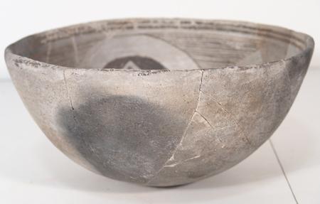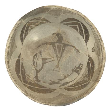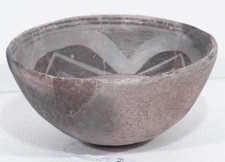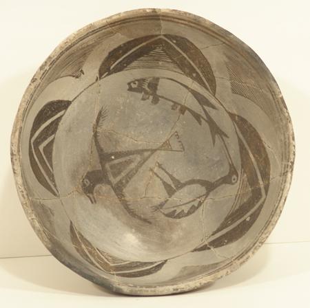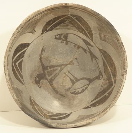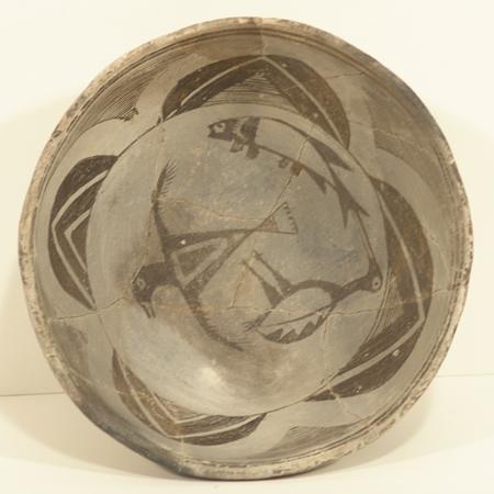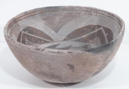 Rare thin-walled black-on-white bowl with two birds and one fish on the inside. Appraisal value $2,500. Condition: excellent visual, some restoration. 4" high x 9" diameter