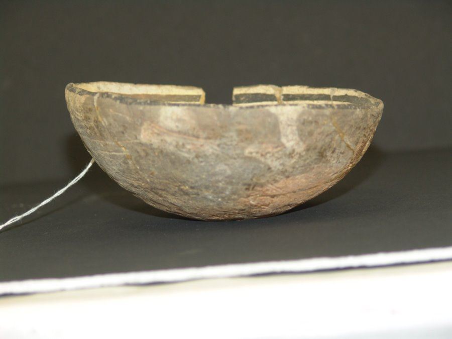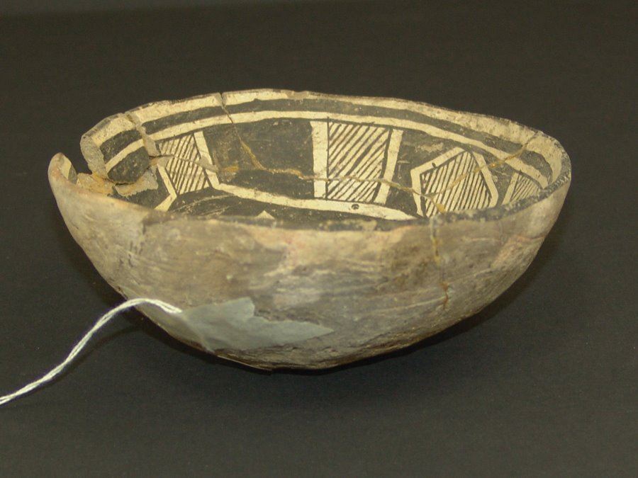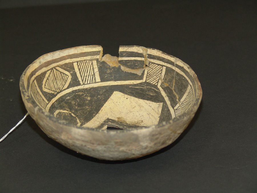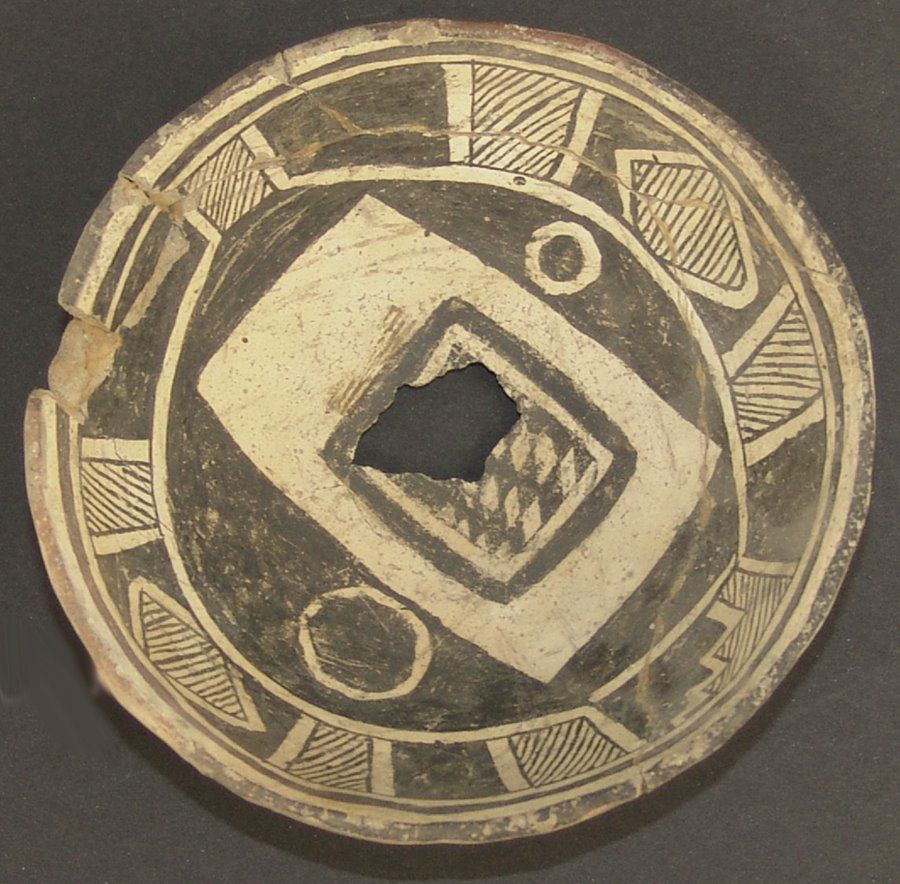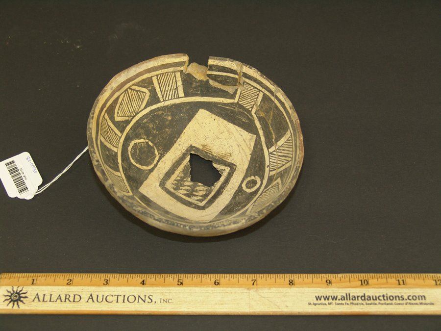 Small killed negative design black on white bowl with hachure rectangles and diamonds, two different sized negative circles, and large white central rectangle having a rectangular design within. Good condition. Glued but not restored. (#40 in the Baca book) Pre- Historic. 2-1/2" x 6"