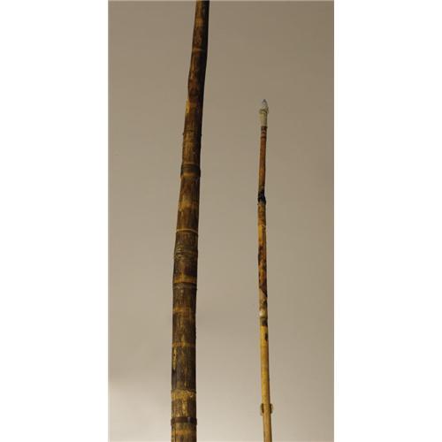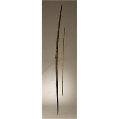 <B>Mimbres Wood Bow and Arrow</B></I><BR>Circa 1000-1200 AD<BR>Length 53 3/4 in. the bow; Length 35 in. the arrow<BR><BR>This ancient wooden bow is wrapped with sinew at various points along its length. Pitch residue is also present. The bow is accompanied by a single reed arrow with a foreshaft with a flint point.<BR>Cached in caves, bows and arrows from the prehistoric Southwest have survived the ravages of time and weather. A group of three, nearly identical to this example, is illustrated in Forrest Fenn's collection. "The bow and arrow made their appearance in America about two thousand years ago…The three Southwest bows shown here could have been made as long ago as 1150. All are wrapped with sinew bands around the shafts, which are nearly circular in cross section. Such wrappings are designed to increase the force of the bow as well as to prevent the wood from shivering from the vibrations of firing...These bows have no nocks to hold the bowstring in place. They rely upon the strings end nooses and the wrappings, as well as the tapering tips, to keep the strings in place."<BR><BR>Provenance<BR>Richard Corrow Collection, Santa Fe, New Mexico.<BR><BR>Reference<BR>Hanson, James A. <I>Spirits in the Art.</B></I> Kansas City: The Lowell Press, 1994, pp. 180 and 181.<BR><BR> <BR><BR><B>Important notic