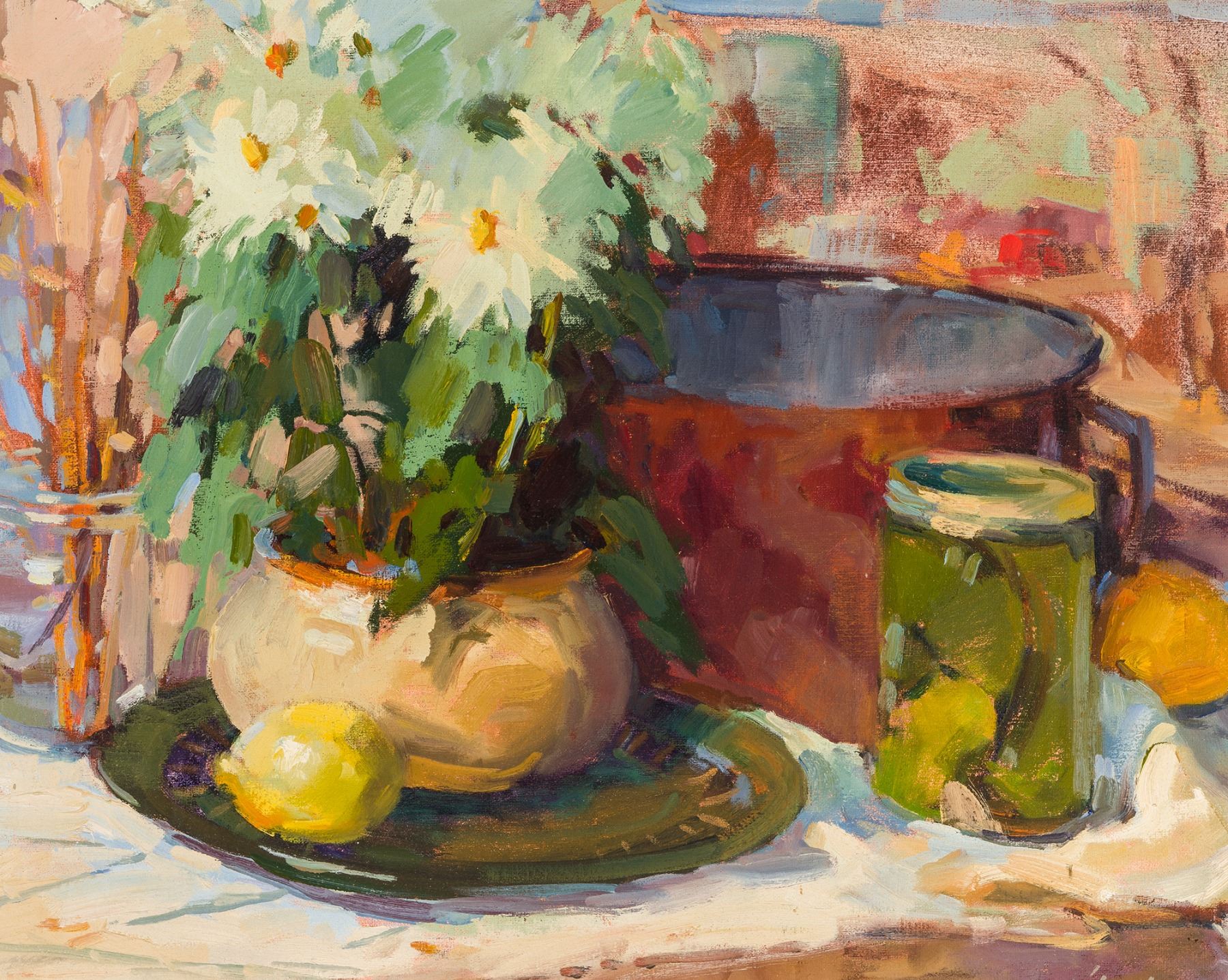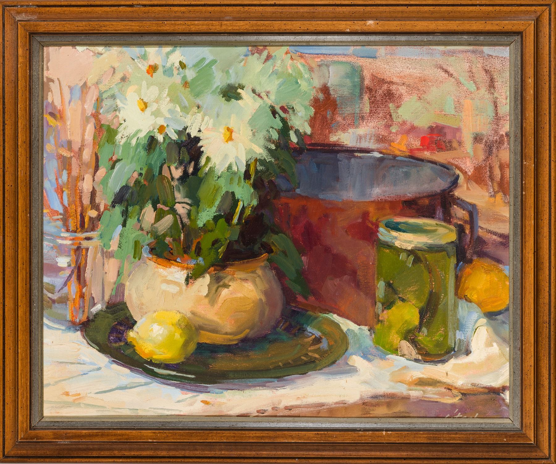 Condition details: This painting is in very good condition. With the unaided eye there are no issues. Closer inspection under ultraviolet light reveals normal fluorescence of artist's pigments, and no signs of restoration. The piece is framed in a brown frame with a silver fillet. The frame is in very good condition with normal wear.