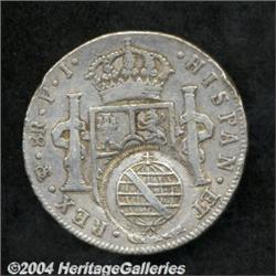 <B>Minas Gerais Counterstamp, </B></I>KM242, host coin Bolivia-Potosi 8 Reales 1807. Very bold VF+ counterstamp on nice F-VF host coin. <BR><BR><B>Important notice:</B> Heritage usually auctions material at the rate of 200-250 lots per hour. On some occasions eBay Live bid software or the Internet may not be able to keep up with the pace of the auction. We recommend placing a realistic absentee bid now as insurance to avoid disappointment. Occasionally the auctioneer may eliminate or reject an eBay Live bid, and the auctioneer may also reopen a lot after the close of the eBay live bidding (usually because we missed an audience bid), and may reject your bid even if it shows you as the winning bidder. By bidding via eBay Live, you agree that Heritage may award the lot to another bidder at its sole discretion under the circumstances described above or any other reasonable circumstances. Since eBay bids are not shown to us until we open the lot on the floor, we treat those bids just like floor bids. In most cases the floor responds before the eBay bid is presented to us, due to Internet lag time, so for consistency we have made it a policy that floor bids are always considered first over tie eBay live bids. Also please note that all Heritage lots purchased through eBay Live carry a 20% Buyer's Premium. Please make sure you read the Terms and Conditions before you bid.