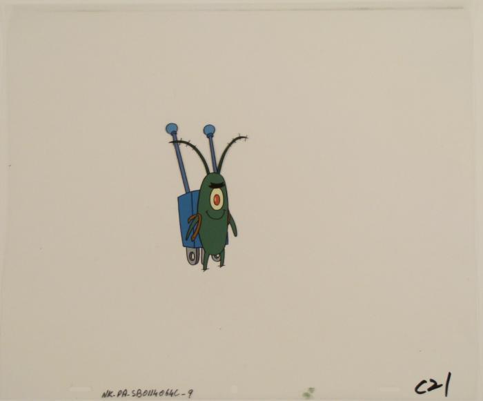 This original animation cel is from the Nickelodeon TV show SpongeBob Squarepants. The story takes place under the deep blue sea in Bikini Bottom, where SpongeBob resides. SpongeBob, who is a yellow, porous sponge, is your typical happy-go-lucky character, as he is always cheerful and enjoys making people laugh. Patrick Star, SpongeBob's neighbor who is a starfish, is your average children's show idiot, as he boasts knowing nothing and is often getting himself into ridiculous situations. Between the homes of these two lies the home of the miserable Squidward, a squid, who is known for being grouchy and playing tricks on SpongeBob and Patrick. Both SpongeBob and Squidward work at the Krusty Krab, a fast food business run by the greedy money-loving Mr. Krabs, a crab, the arch rival of the evil, possibly misunderstood, Plankton. Another neighbor, Sandy Cheeks, an athletic squirrel who normally wears an astronaut's space suit, was introduced in "Tea at the Treedome." She spends most of her time inventing and experimenting. Plankton has his mind control device on his back.Original Production Animated Cel Overall Size of Cel: 10 1/2" x 12 1/2" Very Good ConditionThis is an original hand-painted cel set-up used in the production of an episode of "SpongeBob SquarePants." Each one-of-a-kind set-up represents a slight change in position of the characters. When individually photographed and projected in rapid succession, the images appear to move.