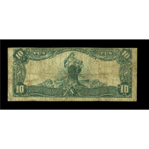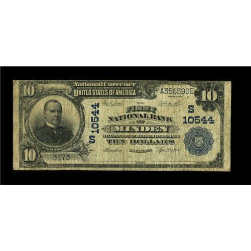 <B>Minden, LA</B></I> - $10 1902 Plain Back Fr. 631 <B>The First NB</B></I> Ch. # (S)10544<BR>An excessively rare note from the only bank to issue in Webster Parish. The census shows four notes extant from here, with only two identified by serial number. The last offering from here came back in 1998, with few appearances before that date. Well circulated but intact <B>Very Good,</B></I> with no problems save honest circulation.<BR><BR><b>Shipping:</b> Coins & Currency (<a target="_blank" href="http://www.heritageauctions.com/common/shipping.php">view shipping information</a>)