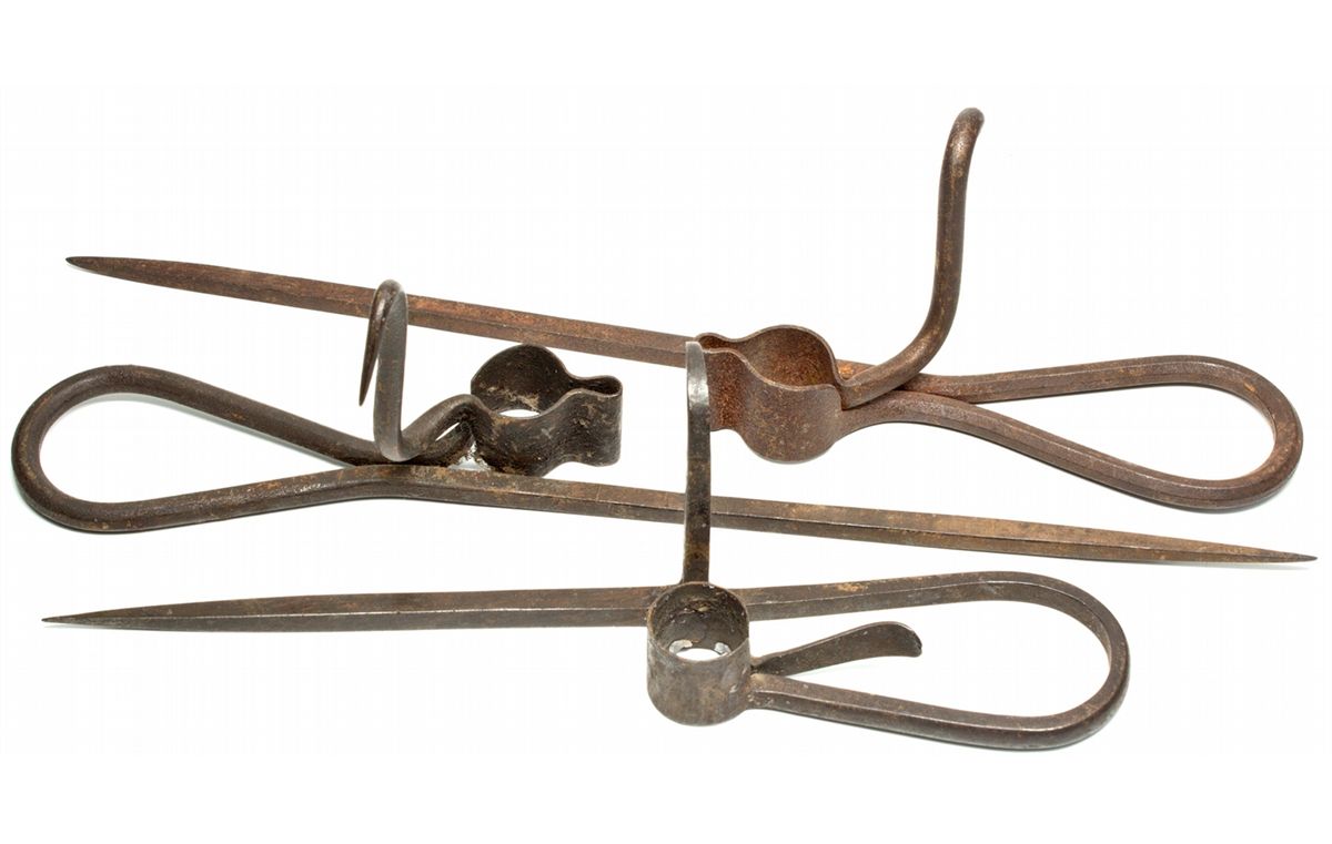 c1880 Lot of 3: Varney style sticks, 2 of which are stamped "Royal," and near identical. The third is a blacksmith stick, similar in size and style, yet uniquely hand-made. This piece measures about 9", approx. 3" shorter than the other 2. Fixed operation, no articulation, some rust patina. Very good condition overall. - HKA#65830