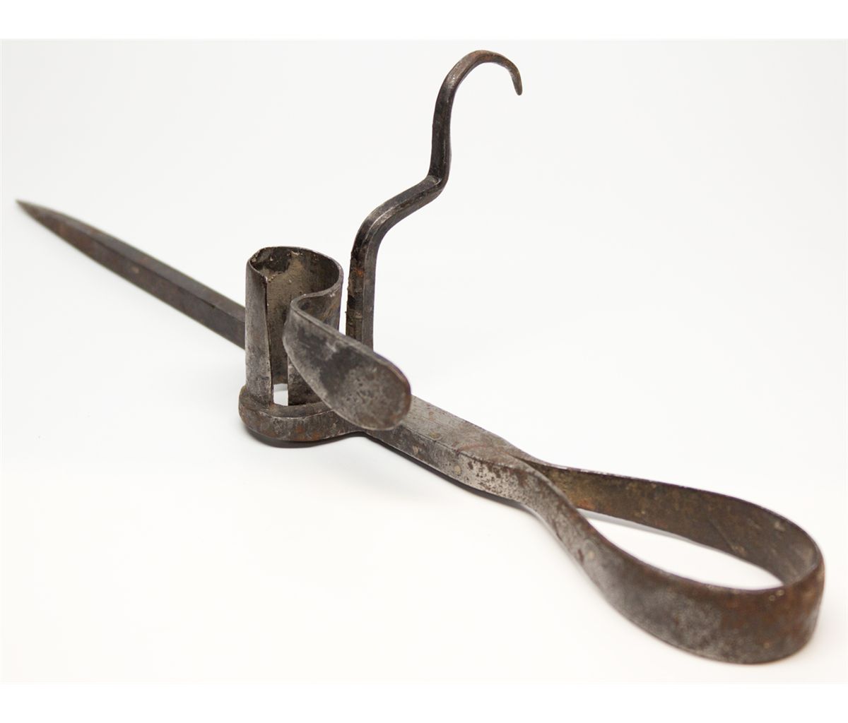 This is an early miner’s candle stick made of nickled steel. There are no markings. It measures 12” in length. From the M.D. Kast Collection. -59254