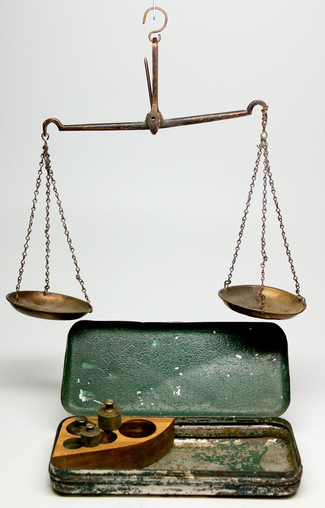 Encased in a green painted metal box, approximately 3" x 7,” with “Miners’ Improved Gold Scale” lettered on the top of the case. “Manufactured expressly for California” written below. -56623