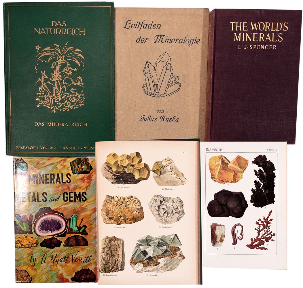 1910 Lot of 5 German and English books. 1) THE WORLD’S MINERALS by Leonard J. Spencer. New York, Frederick A. Stokes Company Publishers. Little wear, includes color plates of minerals. 1913. 2) MINERALS, METALS AND GEMS, by Hyatt Verrill. Grosset and Dunlap Publishers, New York. 1939. Little wear, still has colorful dustcover. 3) & 4) LEITFADEN DER MINERALOGIE, translated as GUIDE TO MINERALOGY. By Julius Ruska. Leipzig. 1910. Some wear on pages and cover. 5) DAS NATURREICH, translated as the REALM OF NATURE. By Karl Schulz, Berlin. 1922. Little wear. Most are illustrated. An eclectic group for the mineralogist. - HKA#65710