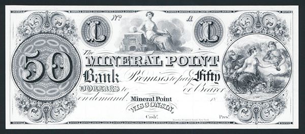 Mineral Point, Wisconsin, 18xx (originally printed in 1830-50's, these are ca.1960-70's), $50, (WI-560-G8a), Modern "Proprietary Proof", middle of note has allegorical women seated on oven, right in large circle is Gryphon, seated Plenty on cornucopias and Mercury, Large even margins, Black printing with no underprint printed on thin white card, CU to Gem Uncirculated condition. RWH.