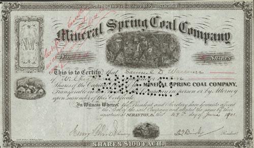 1901, Pennsylvania. Stock certificate for 5 shares. Black. Vignette of miners at work in mine at top center and small vignette of mining town at center left and state seal at bottom center. Pen and perferation cancelled. Very fine.