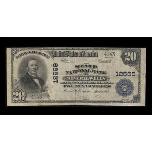 <B>Mineral Wells, TX</B></I> - $20 1902 Plain Back Fr. 661 <B>The State NB</B></I> Ch. # 12669<BR>This is one of 8 Large in the census, with one of those held by the Philpott/Moody Foundation. Remnants of the faded purple signatures are visible on this <B>Fine</B></I> $10 that has a top edge along the frame line.