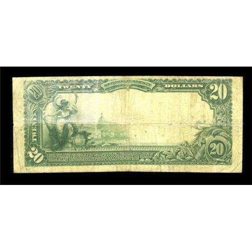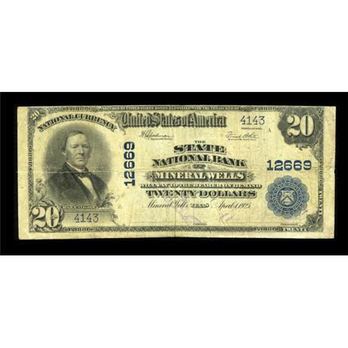 <B>Mineral Wells, TX</B></I> - $20 1902 Plain Back Fr. 661 <B>The State NB</B></I> Ch. # 12669<BR> In a much shorter time span, this institution nearly issued more notes than the First National of Mineral Wells. Its resources also allowed it to survive the depression. This piece is well circulated though it retains all of its printed details. A couple of pinholes are noted, but are only visible when the note is candled. <B>Fine.</B></I><BR><BR><b>Shipping:</b> Coins & Currency (<a target="_blank" href="http://www.heritageauctions.com/common/shipping.php">view shipping information</a>)