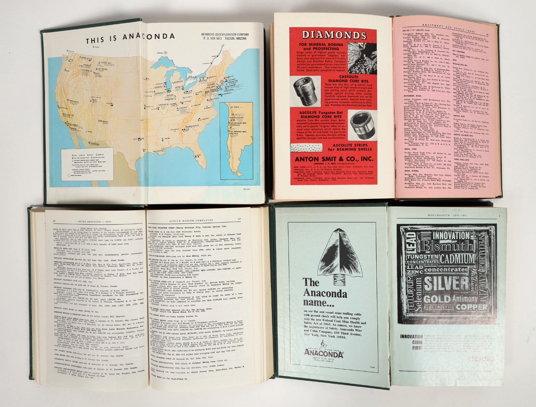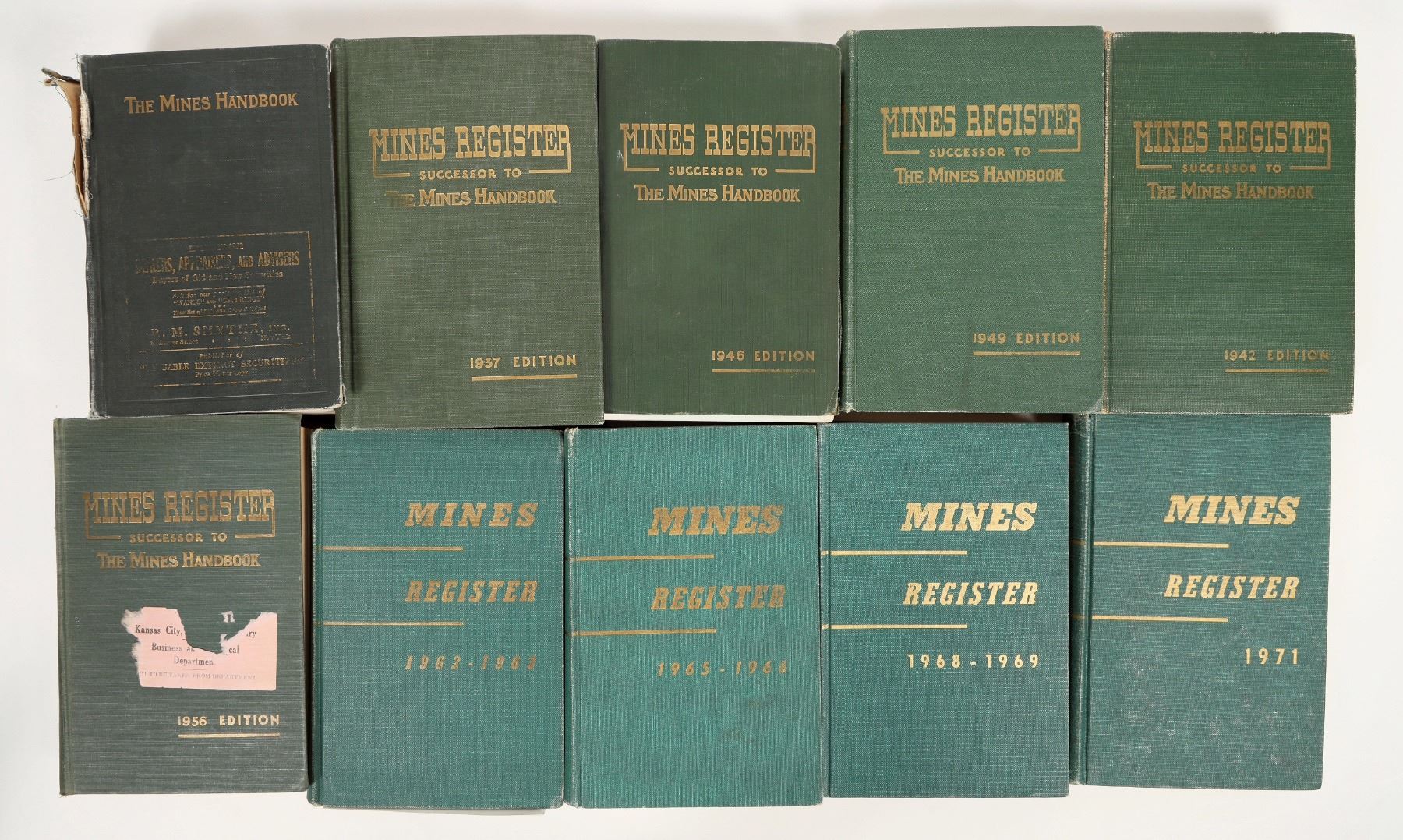 Lot of (10) total hardcover books. Multiple years represented, beginning with The Mines Handbook 1931 volume XVIII Part 1, Mines Register books including 1937 volume XX, volume XXI 1942, volume XXII 1946 (note: spine cover missing, loose pages, cover board fabric torn), volume XXIII 1949, volume XXV 1956, then multi-year editions 1962-63, 1965-66, 1968-69, and finally the 1971 Edition. These green hardcover books are all in very good to excellent condition, with the exception of the notation above, along with volume 1931 exhibiting a partially-torn spine cover. All books do show corner wear and the usual fading titles on a few books. These are also interesting in that the entry pages are period adverting for mining equipment, parts, scales, etc. Terrific references, chock full of all types of mining information, locations, mineral types, ownership, statistics, and more from all US states (listed alphabetically). There are equipment and supply index pages as well. The books typically measure 9"x 6.25", thickness varies. A truly significant mining reference collection, please review. (Please note shipping will be more costly on this heavy lot!)