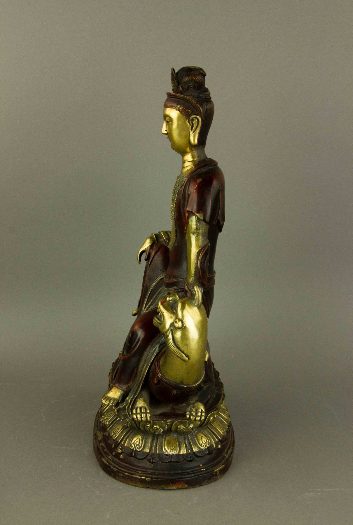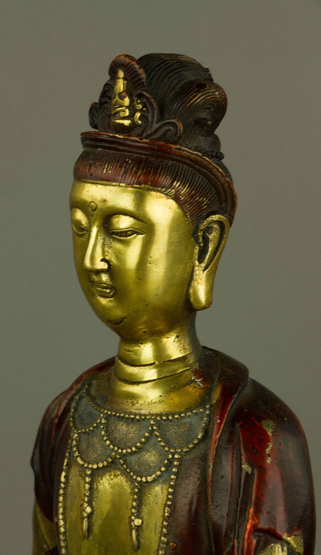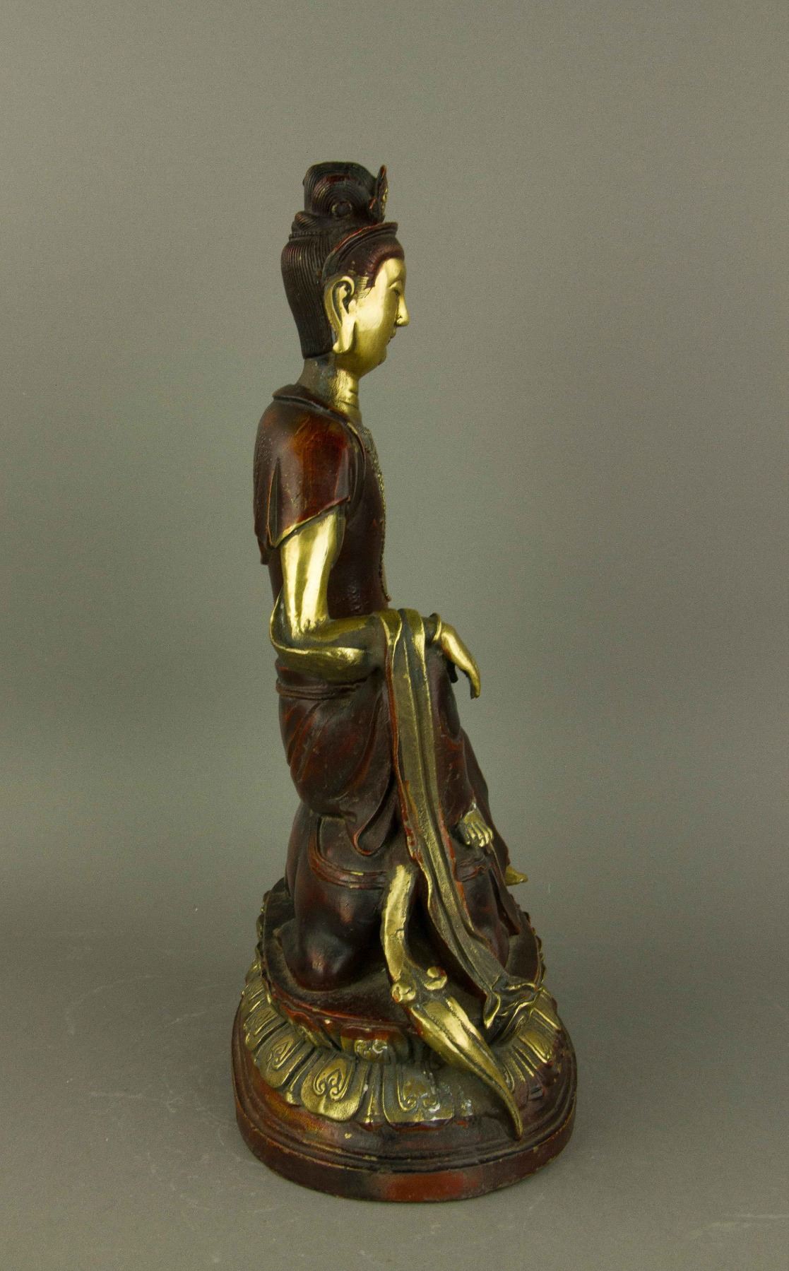 Chinese bronze cast figure; Ming Period 16th or 17th century; depicting Guanyin bodhisattva seated gracefully on a dragon-headed turtle; covered in red lacquer; H: 37 cm, L: 22 cm, 3182 grams