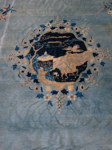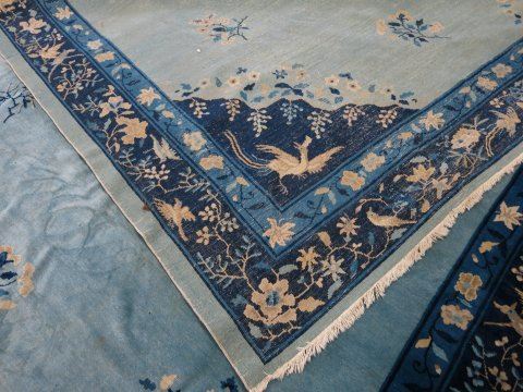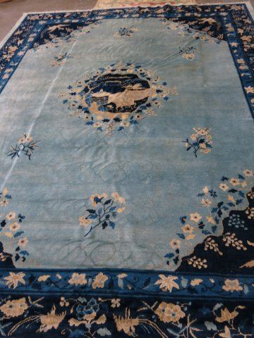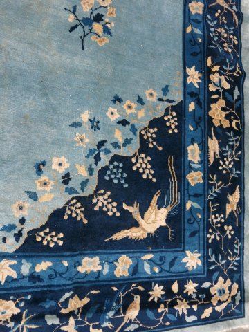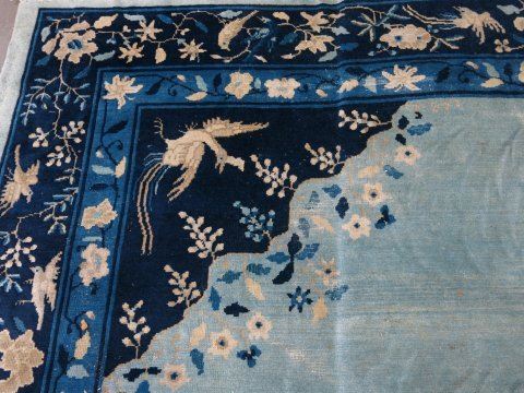Blue background with birds & flowers. Approx. 9' H x 12' W. Mild staining & wear.